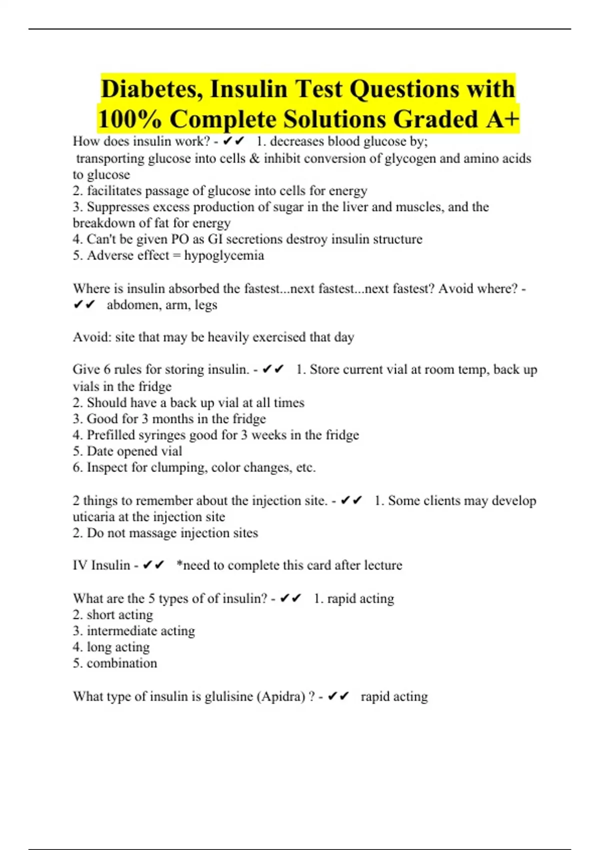 Diabetes, Insulin Test Questions with 100% Complete Solutions Graded A+