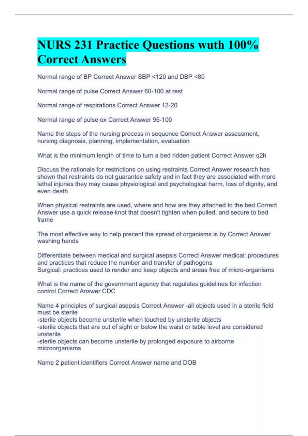 NURS 231 Practice Questions wuth 100% Correct Answers
