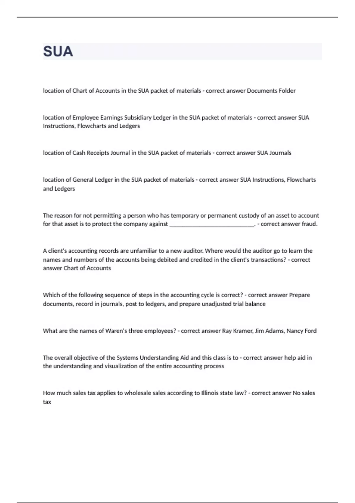 SUAlocation of Chart of Accounts in the SUA packet of materials - correct answer Documents Folder location of Employee Earnings Subsidiary Ledger in the SUA packet of materials - correct answer SUA Instructions, Flowcharts and Ledgers location of Cash Receipts Journal in the SUA packet of materials - correct answer SUA Journals location of General Ledger in the SUA packet of materials - correct answer SUA Instructions, Flowcharts and Ledgers The reason for not permitting a person who has temporary or permanent custody of an asset to account for that asset is to protect the company against __________________________. - correct answer fraud. A client's accounting records are unfamiliar to a new auditor. Where would the auditor go to learn the names and numbers of the accounts being debited and credited in the client's transactions? - correct answer Chart of Accounts Which of the following sequence of steps in the accounting cycle is correct? - correct answer Prepare documents, record in journals, post to ledgers, and prepare unadjusted trial balance What are the names of Waren's three employees? - correct answer Ray Kramer, Jim Adams, Nancy Ford The overall objective of the Systems Understanding Aid and this class is to - correct answer help aid in the understanding and visualization of the entire accounting process How much sales tax applies to wholesale sales according to Illinois state law? - correct answer No sales tax On January 15, Waren Sports Supply purchased on account $120,000 in from their vendor Velocity Sporting Goods. On February 10 they paid the vendor in full for this purchase. The correct journal entry is - correct answer Debit Accounts Payable $120,000 Credit Cash $120,000 Which of the following statements are true? - correct answer Original entries are recorded in journals and journal account totals are posted to ledgers periodically. According to the flowchart on page 31 of the Reference book, the process of preparing the bank reconciliation is done by a person - correct answer True An arrow with a dotted line (- - - - ) in a systems flowchart indicates which of the following? - correct answer Only information flow, not document flow When Waren Sports Supply receives a check in the mail in payment of an account receivable, the following actions are taken in this order: - correct answer Restrictively endorse check, enter on cash receipts prelist, make entry in cash receipts journal and accounts receivable subsidiary ledger A bank deposit is made each day cash is received. Who is responsible for making the deposit? - correct answer Ray Kramer At Waren Sports Supply who is responsible for restrictively endorsing a check upon receipt? - correct answer Jim Adams In the sales cycle, who reviews the sales invoice and support documents for accuracy? - correct answer Jim Adams There are seven steps to recording a transaction in the SUA, put them in the correct order - correct answer 1. Read and analyze the transaction. Correct2.