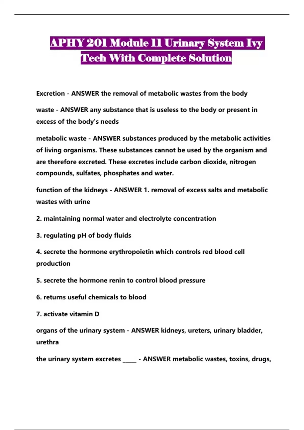 APHY 201 Module 11 Urinary System Ivy Tech With Complete Solution...