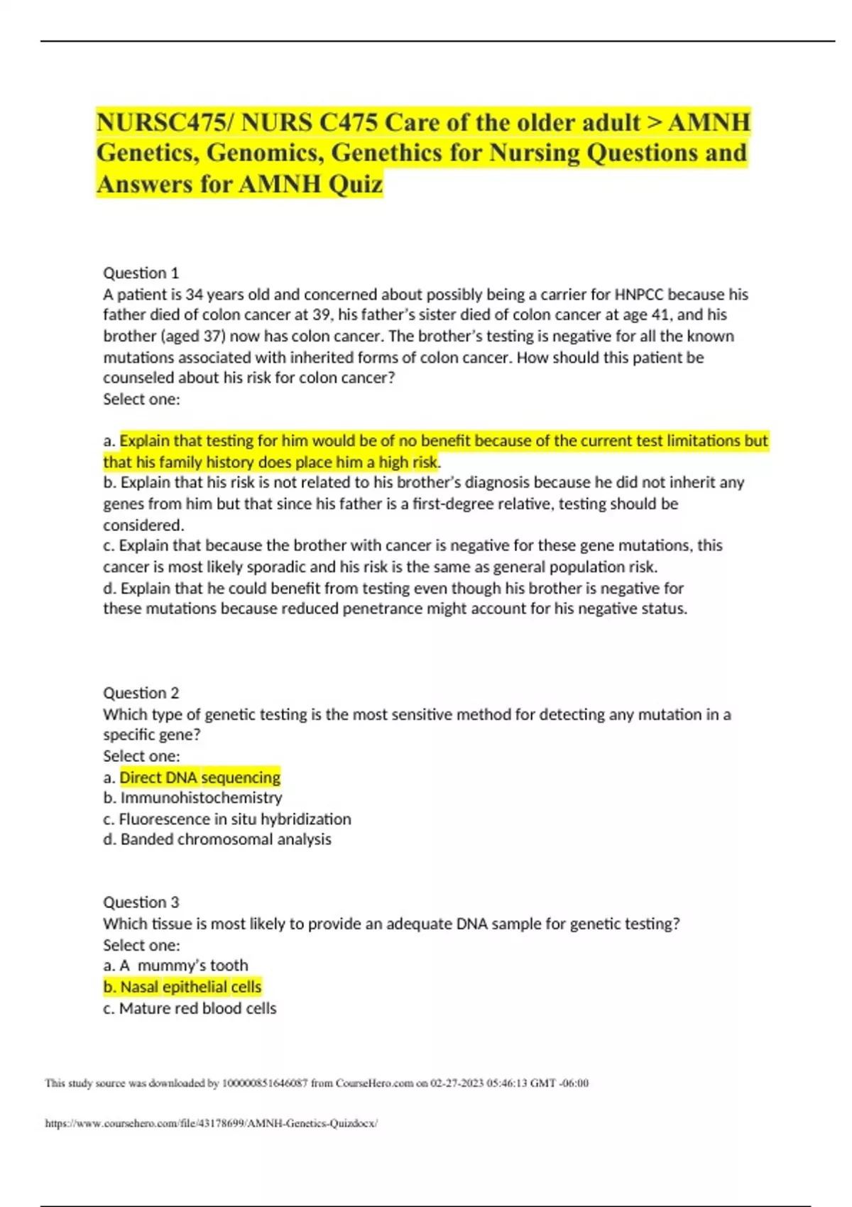 NURSC475/ NURS C475 Care of the older adult > AMNH Genetics, Genomics, Genethics for Nursing Questions and Answers for AMNH Quiz Question 1 A patient is 34 years old and concerned about possibly being a carrier for HNPCC because his father died of colon cancer at 39, his father’s sister died of colon cancer at age 41, and his brother (aged 37) now has colon cancer. The brother’s testing is negative for all the known mutations associated with inherited forms of colon cancer. How should this patient be counseled about his risk for colon cancer? Select one: Explain that testing for him would be of no benefit because of the current test limitations but that his family history does place him a high risk. Explain that his risk is not related to his brother’s diagnosis because he did not inherit any genes from him but that since his father is a first-degree relative, testing should be considered. Explain that because the brother with cancer is negative for these gene mutations, this cancer is most likely sporadic and his risk is the same as general population risk. Explain that he could benefit from testing even though his brother is negative for these mutations because reduced penetrance might account for his negative status. Question 2 Which type of genetic testing is the most sensitive method for detecting any mutation in a specific gene? Select one: Direct DNA sequencing Immunohistochemistry Fluorescence in situ hybridization Banded chromosomal analysis Question 3 Which tissue is most likely to provide an adequate DNA sample for genetic testing? Select one: a. A mummy’s tooth b. Nasal epithelial cells c. Mature red blood cells d. Distal ends of hair shafts Question 4 Which lethal cardiac arrhythmia can occur as a complication of long QT syndrome? Select one: Atrial node reentry tachycardia Prolonged atrial fibrillation c. Torsade de Pointes d. Mitral valve prolapse Question 5 What would be the expected response to a skin injury if the involved tissue had lost the normal cell characteristic of contact inhibition? Select one: Excessive growth of replacement tissue Replacement with scar tissue rather than skin Failure of the wound to close Displacement of skin cells into other body tissues Question 6 What would be the patient’s response to a normal drug dose that because of a genetic variation in an enzyme that prepares the drug for elimination results in a blood drug level that is below the minimum effective concentration (MEC)? Select one: The drug’s duration of action is longer than expected. The risk for toxic side effects is increased. Drug entry exceeds drug elimination The intended response fails to be produced. Question 7 Which statement best describes the role of tumor suppressor genes in cancer development? Select one: Tumor suppressor genes control or modify the activity of oncogenes, reducing the risk for cancer development.