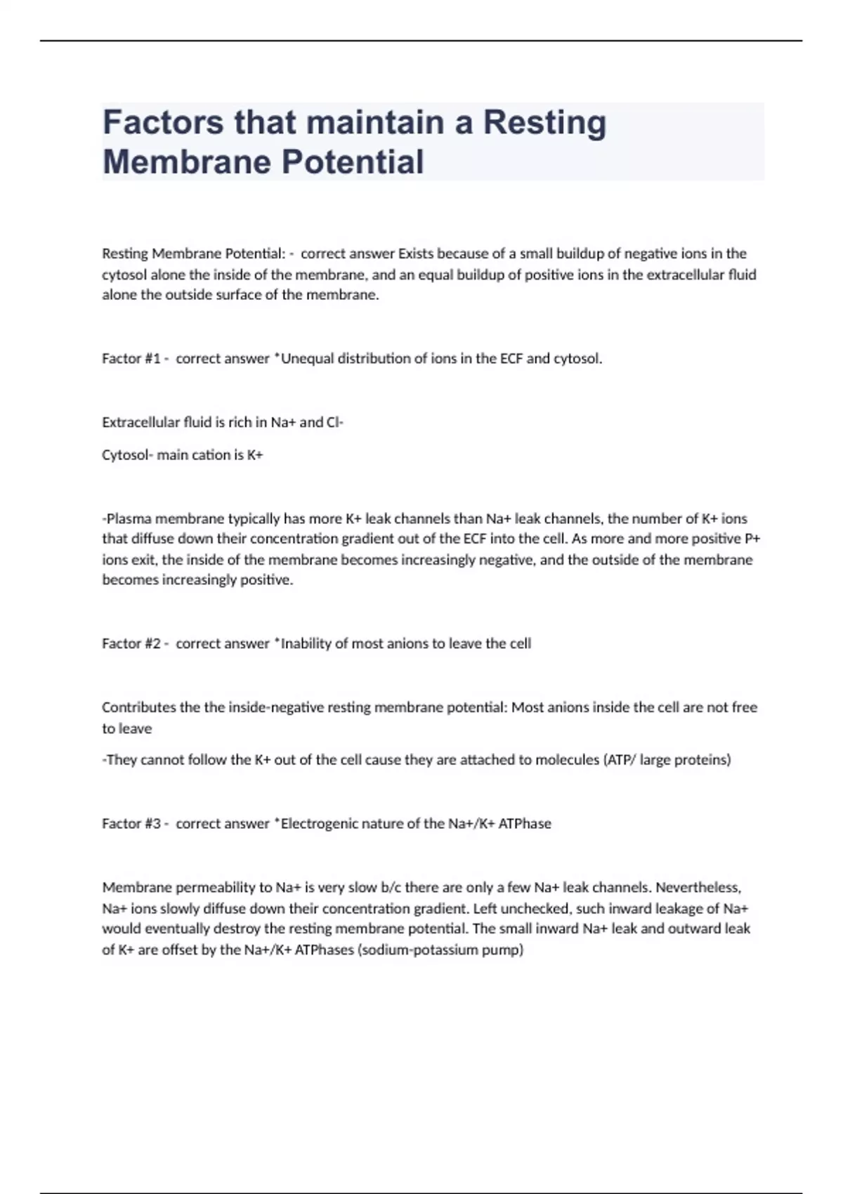 Factors that maintain a Resting Membrane Potential Resting Membrane Potential: - correct answer Exists because of a small buildup of negative ions in the cytosol alone the inside of the membrane, and an equal buildup of positive ions in the extracellular fluid alone the outside surface of the membrane. Factor #1 - correct answer *Unequal distribution of ions in the ECF and cytosol. Extracellular fluid is rich in Na+ and Cl- Cytosol- main cation is K+ -Plasma membrane typically has more K+ leak channels than Na+ leak channels, the number of K+ ions that diffuse down their concentration gradient out of the ECF into the cell. As more and more positive P+ ions exit, the inside of the membrane becomes increasingly negative, and the outside of the membrane becomes increasingly positive. Factor #2 - correct answer *Inability of most anions to leave the cell Contributes the the inside-negative resting membrane potential: Most anions inside the cell are not free to leave -They cannot follow the K+ out of the cell cause they are attached to molecules (ATP/ large proteins) Factor #3 - correct answer *Electrogenic nature of the Na+/K+ ATPhase Membrane permeability to Na+ is very slow b/c there are only a few Na+ leak channels. Nevertheless, Na+ ions slowly diffuse down their concentration gradient. Left unchecked, such inward leakage of Na+ would eventually destroy the resting membrane potential. The small inward Na+ leak and outward leak of K+ are offset by the Na+/K+ ATPhases (sodium-potassium pump) Pumps help maintain RMP by pumping out NA+ as fast as it leaks back in. At the same time the ATPhases bring in K+