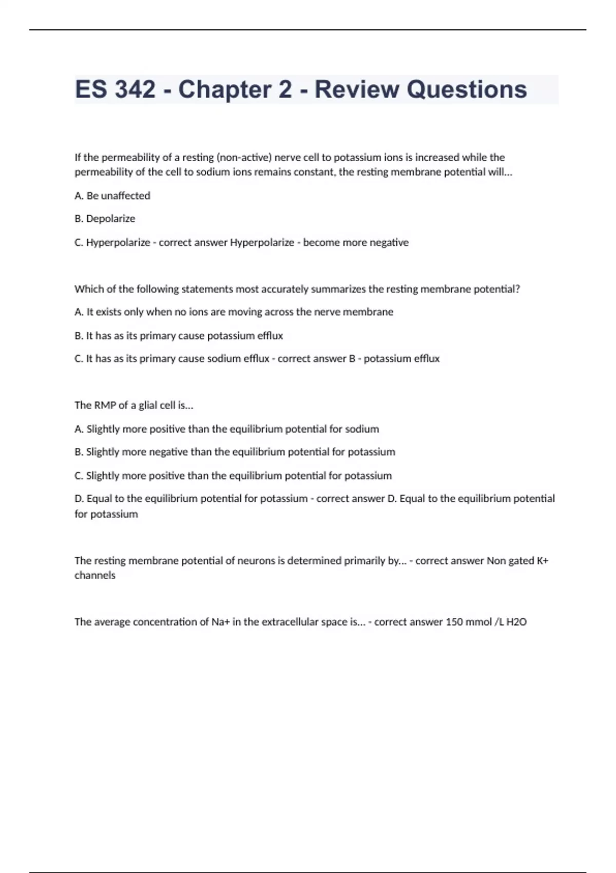 ES 342 - Chapter 2 - Review Questions.If the permeability of a resting (non-active) nerve cell to potassium ions is increased while the permeability of the cell to sodium ions remains constant, the resting membrane potential will... A. Be unaffected B. Depolarize C. Hyperpolarize - correct answer Hyperpolarize - become more negative Which of the following statements most accurately summarizes the resting membrane potential? A. It exists only when no ions are moving across the nerve membrane B. It has as its primary cause potassium efflux C. It has as its primary cause sodium efflux - correct answer B - potassium efflux The RMP of a glial cell is... A. Slightly more positive than the equilibrium potential for sodium B. Slightly more negative than the equilibrium potential for potassium C. Slightly more positive than the equilibrium potential for potassium D. Equal to the equilibrium potential for potassium - correct answer D. Equal to the equilibrium potential for potassium The resting membrane potential of neurons is determined primarily by... - correct answer Non gated K+ channels The average concentration of Na+ in the extracellular space is... - correct answer 150 mmol /L H2O