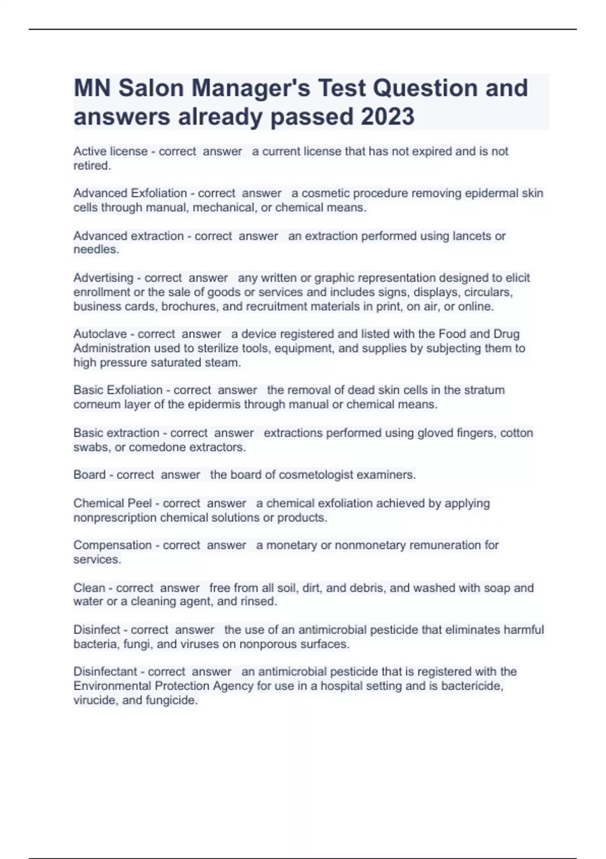 MN Salon Manager Question and answers 100% correct 2023/2024Active license - correct answer a current license that has not expired and is not retired. Advanced Exfoliation - correct answer a cosmetic procedure removing epidermal skin cells through manual, mechanical, or chemical means. Advanced extraction - correct answer an extraction performed using lancets or needles. Advertising - correct answer any written or graphic representation designed to elicit enrollment or the sale of goods or services and includes signs, displays, circulars, business cards, brochures, and recruitment materials in print, on air, or online. Autoclave - correct answer a device registered and listed with the Food and Drug Administration used to sterilize tools, equipment, and supplies by subjecting them to high pressure saturated steam. Basic Exfoliation - correct answer the removal of dead skin cells in the stratum corneum layer of the epidermis through manual or chemical means.