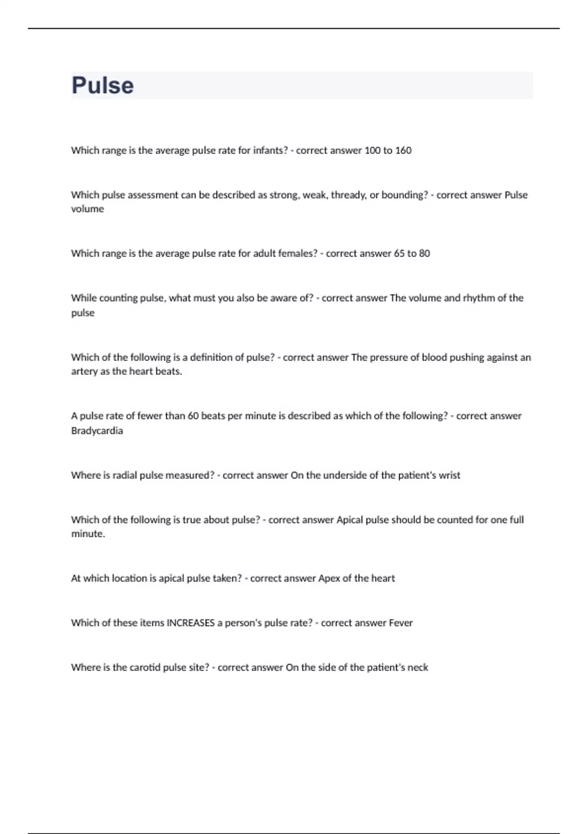 Pulse Which range is the average pulse rate for infants? - correct answer 100 to 160 Which pulse assessment can be described as strong, weak, thready, or bounding? - correct answer Pulse volume Which range is the average pulse rate for adult females? - correct answer 65 to 80 While counting pulse, what must you also be aware of? - correct answer The volume and rhythm of the pulse Which of the following is a definition of pulse? - correct answer The pressure of blood pushing against an artery as the heart beats. A pulse rate of fewer than 60 beats per minute is described as which of the following? - correct answer Bradycardia Where is radial pulse measured? - correct answer On the underside of the patient's wrist Which of the following is true about pulse? - correct answer Apical pulse should be counted for one full minute. At which location is apical pulse taken? - correct answer Apex of the heart Which of these items INCREASES a person's pulse rate? - correct answer Fever Where is the carotid pulse site? - correct answer On the side of the patient's neck Mr. Dennis states that he has an arrhythmia. What do you now know about the patient? - correct answer The patient may have an abnormal pulse rhythm. Which is the correct way to record pulse data? - correct answer P 68 strong and regular Which is an acceptable way to measure radial pulse? - correct answer Count pulse for one full minute Count pulse for 30 seconds and then multiply the number by 2 Count for 15 seconds and then multiply by 4 All of the above Which example is the correct way to record apical pulse? - correct answer AP 68 strong and regular Which range is the average pulse rate for adult males? - correct answer 60 to 70 Which method involves examination by listening to the sounds of the body? - correct answer Auscultation What is pulse deficit? - correct answer Fewer pulses than heartbeats means that the heart is either too weak or is beating too fast