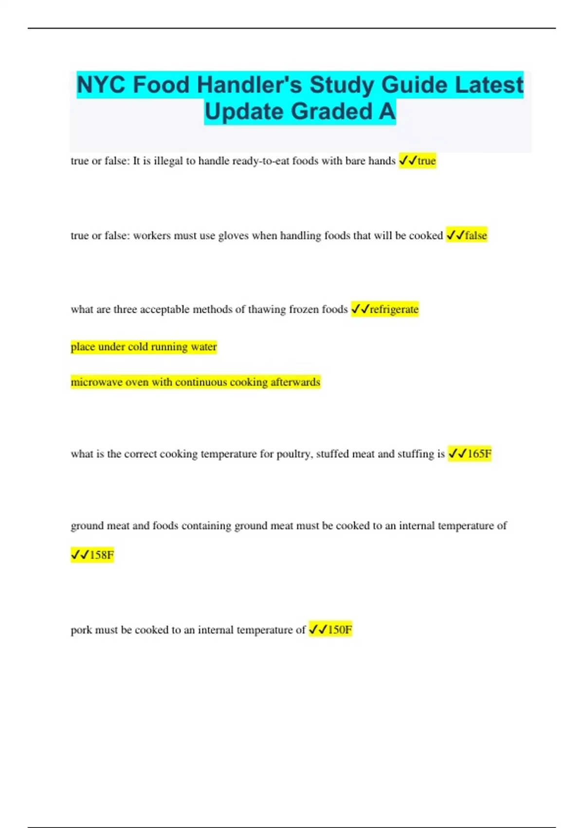 NYC Food Handler's Study Guide Latest Update Graded A