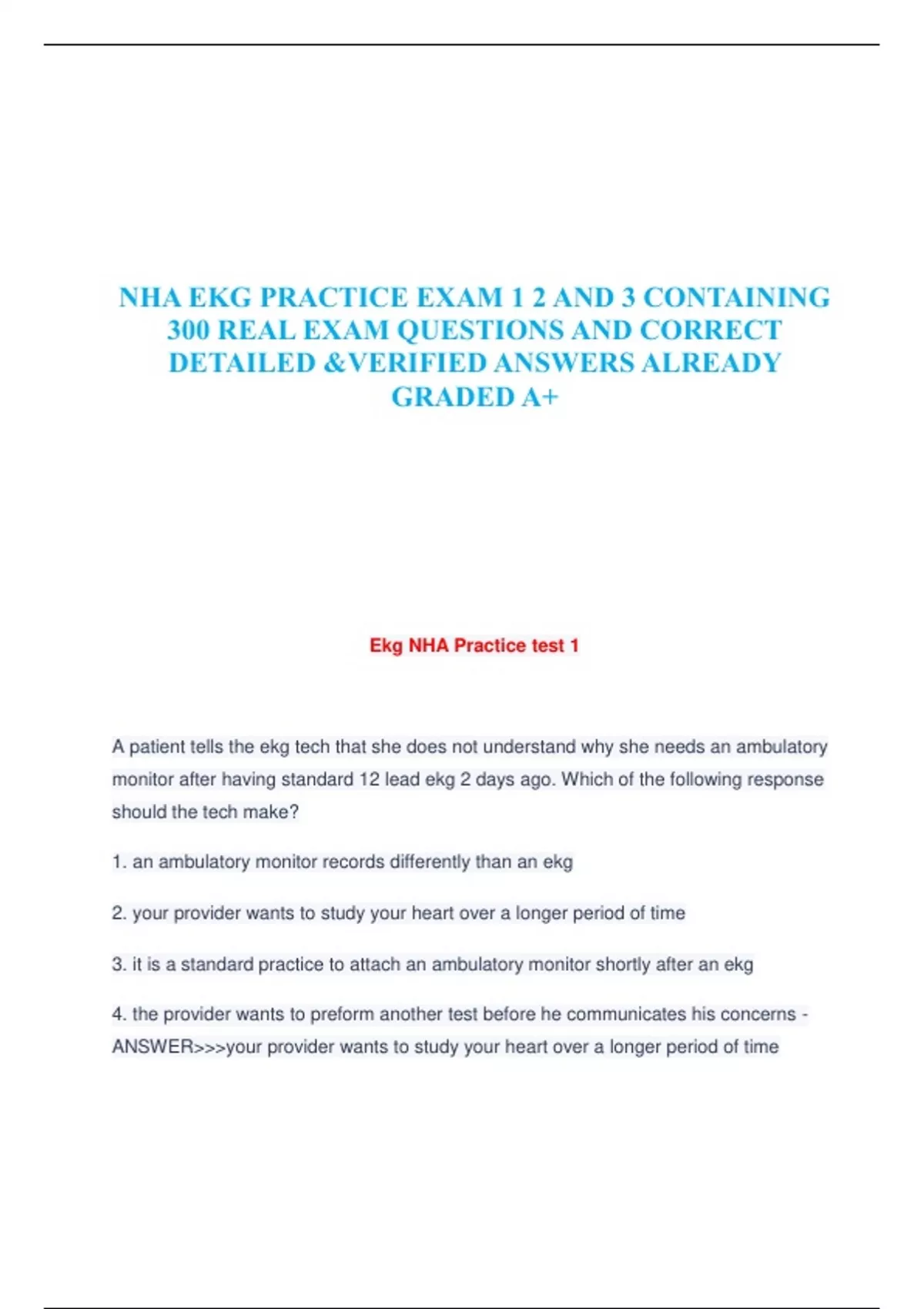 NHA EKG PRACTICE EXAM 1 2 AND 3 CONTAINING 300 REAL EXAM QUESTIONS AND CORRECT DETAILED &VERIFIED ANSWERS ALREADY GRADED A+