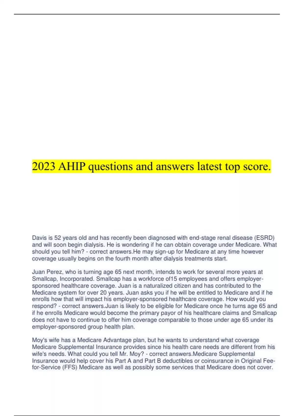 2023 AHIP questions and answers latest top score. Davis is 52 years old and has recently been diagnosed with end-stage renal disease (ESRD) and will soon begin dialysis. He is wondering if he can obtain coverage under Medicare. What should you tell him? - correct answers.He may sign-up for Medicare at any time however coverage usually begins on the fourth month after dialysis treatments start. Juan Perez, who is turning age 65 next month, intends to work for several more years at Smallcap, Incorporated. Smallcap has a workforce of15 employees and offers employersponsored healthcare coverage. Juan is a naturalized citizen and has contributed to the Medicare system for over 20 years. Juan asks you if he will be entitled to Medicare and if he enrolls how that will impact his employer-sponsored healthcare coverage. How would you respond? - correct answers.Juan is likely to be eligible for Medicare once he turns age 65 and if he enrolls Medicare would become the primary payor of his healthcare claims and Smallcap does not have to continue to offer him coverage comparable to those under age 65 under its employer-sponsored group health plan. Moy's wife has a Medicare Advantage plan, but he wants to understand what coverage Medicare Supplemental Insurance provides since his health care needs are different from his wife's needs. What could you tell Mr. Moy? - correct answers.Medicare Supplemental Insurance would help cover his Part A and Part B deductibles or coinsurance in Original Feefor-Service (FFS) Medicare as well as possibly some services that Medicare does not cover. Peňa is 66 years old, has coverage under an employer plan, and will retire next year. She heard she must enroll in Part B at the beginning of the year to ensure no gap in coverage. What can you tell her? - correct answers.She may enroll at any time while she is covered under her employer plan, but she will have a special eight-month enrollment period after the last month on her employer plan that differs from the standard general enrollment period, during which she may enroll in Medicare Part B. Chen will be 65 soon, has been a citizen for twelve years, has been employed full time, and paid taxes during that entire period. She is concerned that she will not qualify for coverage under part A because she was not born in the United States. What should you tell her? - correct answers.Most individuals who are citizens and age 65 or over are covered under Part A by virtue of having paid Medicare taxes while working, though some may be covered as a result of paying monthly premiums. Gonzalez is enrolled in Original Medicare and has a Medigap policy as well, but it provides no drug coverage. She would like to keep the coverage she has but replace her existing Medigap plan with one that provides drug coverage. What should you tell her? - correct answers.Mrs. Gonzalez cannot purchase a Medigap plan that covers drugs, but she could keep her Medigap policy and enroll in a Part D prescription drug plan. West wears glasses and dentures and has enjoyed considerable pain relief from arthritis through massage t