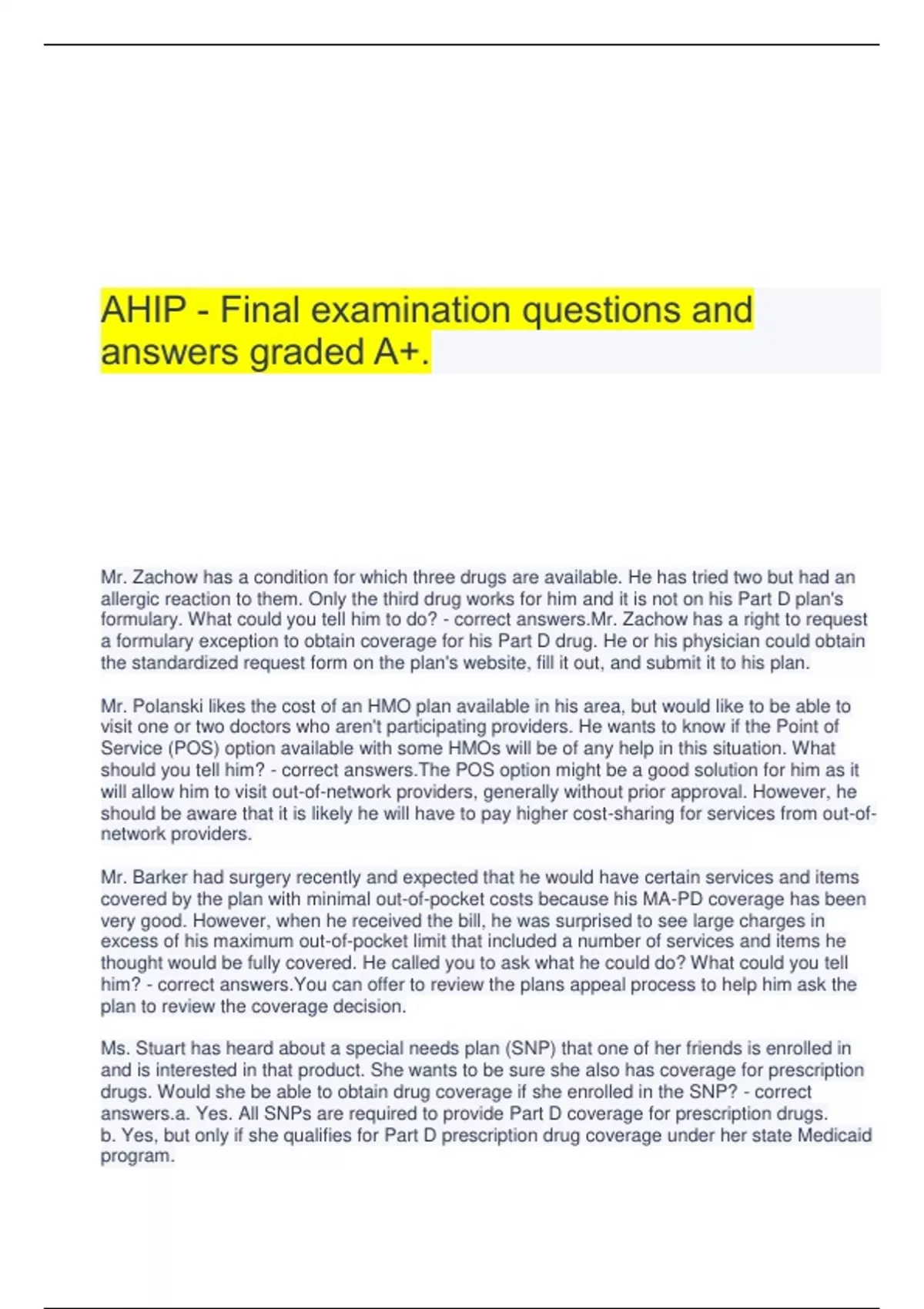 AHIP - Final examination questions and answers graded A+. Mr. Zachow has a condition for which three drugs are available. He has tried two but had an allergic reaction to them. Only the third drug works for him and it is not on his Part D plan's formulary. What could you tell him to do? - correct answers.Mr. Zachow has a right to request a formulary exception to obtain coverage for his Part D drug. He or his physician could obtain the standardized request form on the plan's website, fill it out, and submit it to his plan. Mr. Polanski likes the cost of an HMO plan available in his area, but would like to be able to visit one or two doctors who aren't participating providers. He wants to know if the Point of Service (POS) option available with some HMOs will be of any help in this situation. What should you tell him? - correct answers.The POS option might be a good solution for him as it will allow him to visit out-of-network providers, generally without prior approval. However, he should be aware that it is likely he will have to pay higher cost-sharing for services from out-ofnetwork providers. Mr. Barker had surgery recently and expected that he would have certain services and items covered by the plan with minimal out-of-pocket costs because his MA-PD coverage has been very good. However, when he received the bill, he was surprised to see large charges in excess of his maximum out-of-pocket limit that included a number of services and items he thought would be fully covered. He called you to ask what he could do? What could you tell him? - correct answers.You can offer to review the plans appeal process to help him ask the plan to review the coverage decision. Ms. Stuart has heard about a special needs plan (SNP) that one of her friends is enrolled in and is interested in that product. She wants to be sure she also has coverage for prescription drugs. Would she be able to obtain drug coverage if she enrolled in the SNP? - correct answers.a. Yes. All SNPs are required to provide Part D coverage for prescription drugs. b. Yes, but only if she qualifies for Part D prescription drug coverage under her state Medicaid program. c. No. Medicare beneficiaries who enroll in an SNP must always obtain their drug coverage through a stand-alone Part D Medicare prescription drug plan that they sign up for independent of their enrollment in the SNP. d. Maybe. Some SNPs offer Part D coverage for prescription drugs and some do not. = ????? Phiona works in the IT Department of BestCare Health Plan. Phiona is placed in charge of BestCare's efforts to facilitate electronic enrollment in its Medicare Advantage plans. In setting up the enrollment site, which of the following must Phiona consider? - correct answers.II. All data elements required to complete an enrollment request must be captured. III. The process must include a clear and distinct step that requires the applicant to activate an "Enroll Now" or "I Agree" type of button or tool. Ms. Lewis understands that Medicare prescription drug plans may use various methods to control the use o