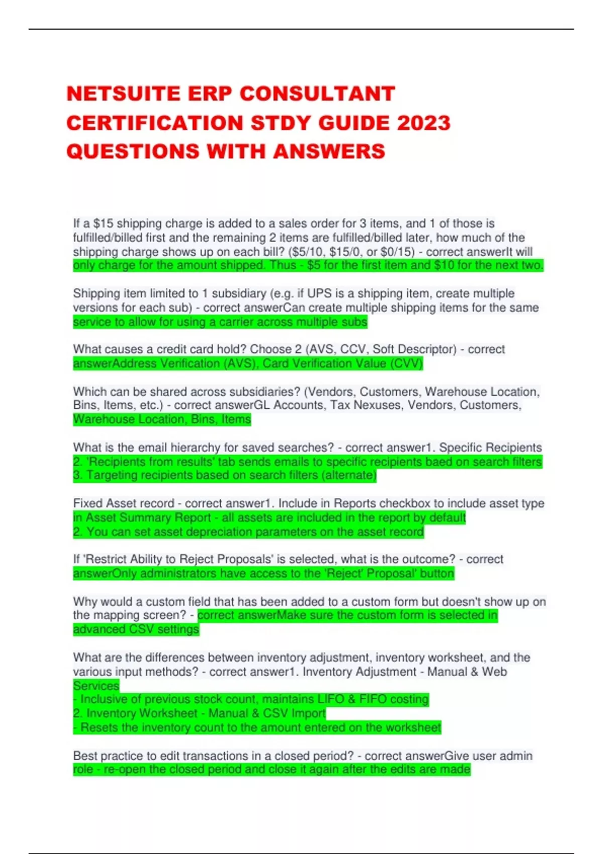 NETSUITE ERP CONSULTANT CERTIFICATION STDY GUIDE 2023 QUESTIONS WITH ANSWERS If a $15 shipping charge is added to a sales order for 3 items, and 1 of those is fulfilled/billed first and the remaining 2 items are fulfilled/billed later, how much of the shipping charge shows up on each bill? ($5/10, $15/0, or $0/15) - correct answerIt will only charge for the amount shipped. Thus - $5 for the first item and $10 for the next two. Shipping item limited to 1 subsidiary (e.g. if UPS is a shipping item, create multiple versions for each sub) - correct answerCan create multiple shipping items for the same service to allow for using a carrier across multiple subs What causes a credit card hold? Choose 2 (AVS, CCV, Soft Descriptor) - correct answerAddress Verification (AVS), Card Verification Value (CVV) Which can be shared across subsidiaries? (Vendors, Customers, Warehouse Location, Bins, Items, etc.) - correct answerGL Accounts, Tax Nexuses, Vendors, Customers, Warehouse Location, Bins, Items What is the email hierarchy for saved searches? - correct answer1. Specific Recipients 2. 'Recipients from results' tab sends emails to specific recipients baed on search filters 3. Targeting recipients based on search filters (alternate) Fixed Asset record - correct answer1. Include in Reports checkbox to include asset type in Asset Summary Report - all assets are included in the report by default 2. You can set asset depreciation parameters on the asset record If 'Restrict Ability to Reject Proposals' is selected, what is the outcome? - correct answerOnly administrators have access to the 'Reject' Proposal' button Why would a custom field that has been added to a custom form but doesn't show up on the mapping screen? - correct answerMake sure the custom form is selected in advanced CSV settings What are the differences between inventory adjustment, inventory worksheet, and the various input methods? - correct answer1. Inventory Adjustment - Manual & Web Services - Inclusive of previous stock count, maintains LIFO & FIFO costing 2. Inventory Worksheet - Manual & CSV Import - Resets the inventory count to the amount entered on the worksheet Best practice to edit transactions in a closed period? - correct answerGive user admin role - re-open the closed period and close it again after the edits are made Where can the foreign exchange rate be configured to the historical exchange rate? - correct answerSubsidiary Conditions for accepting consolidated payments for child customers? - correct answerMust be same currency & same subsidiary On which record do you enter tracking number, if you are NOT using a shipping integration? - correct answerItem fulfillment record What happens when there is a credit card on a sales order? - correct answer1. Authorize 2. Charge/capture (upon fulfillment) Customer center vs. Account center - correct answer1. Customer center - a role, accessible from 2. My Account - only available from the eCommerce site Review the SQL functions - correct answer1. CASE - Returns values based on different conditions 2. DECODE - Compares each expression to each search value 1 by 1 - IF expression = x, result is returned, IF not, default is returned 3. ISNULL - Replaces Null with another value 4. NULLIF - If two expressions are equal, then null is returned Which edition doesn't calculate tax out of the box? - correct answerUnited States Which field type to use for which scenario? 1. Hidden 2. Normal 3. Inline 4. Disabled - correct answer1. Hidden - field cannot be seen on the record or transaction 2. Normal - field can be edited 3. Inline - used for informational purposes - cannot be edited 4. Disabled - field cannot be edited How to delete data in bulk? - correct answer1. Inline 2. Suitescript 3. Delete all data 4. CSV import How to restrict a role to a custom form? - correct answer1. Hide or disable custom form field - other users would not be able to switch out of this custom form 2. Clear the enabled checkbox for all other forms under Customize Role Forms - Role could get access to new custom forms 3. Use the restricted checkbox under Customize Role Forms - this is the best method 4. On the custom form, mark preferred for the user's role - user can still access other forms What causes posting to COGS? - correct answer1. Standalone invoice 2. Item fulfillment How to prevent returned items from being added back into inventory? - correct answer1. Clear re-stock option on item record 2. Enter write-off account on item return record How to view records without NS login? - correct answerFile cabinet - 'Make all Files available without Login' Which transaction records are posting? - correct answer1. Invoice 2. Vendor Bill 3. Cash Sale Which account types can only be linked with a single subsidiary? - correct answerBank accounts & credit cards KPI Scorecard vs. KPIs vs. KPI Meter - correct answer1. KPI - critical biz metrics, individual line within a portlet 2. KPI Scorecard - compares multiple KPIs over multiple date ranges + accounting periods 3. KPI meter - displays the KPI in a semi-circular meter with date ranges How to enable multiple addresses for one order? - correct answer1. Enable multiple shipping routes & line item shipping Why use global permissions? - correct answerGlobal permissions apply to all of a user's roles & and supersedes permissions set on role Can SuiteFlow trigger SuiteScript - correct answerYes What are the credit card hold settings? - correct answer1. Ignore - doesn't matter if customer has met or exceeded their credit limit 2. Warn Only - Generates a warning when transaction is entered that puts a customer at or above the limit 3. Enforce holds - blocks entry of transaction for a customer at or above the limit 4. Days overdue for warning/hold - # of days overdue to generate warning or enforce hold Revenue recognition options - correct answer1. Revenue commitment - allows rev rec before billing 2. Rev rec schedule - shows list of revenue recognition journal entries to be gener