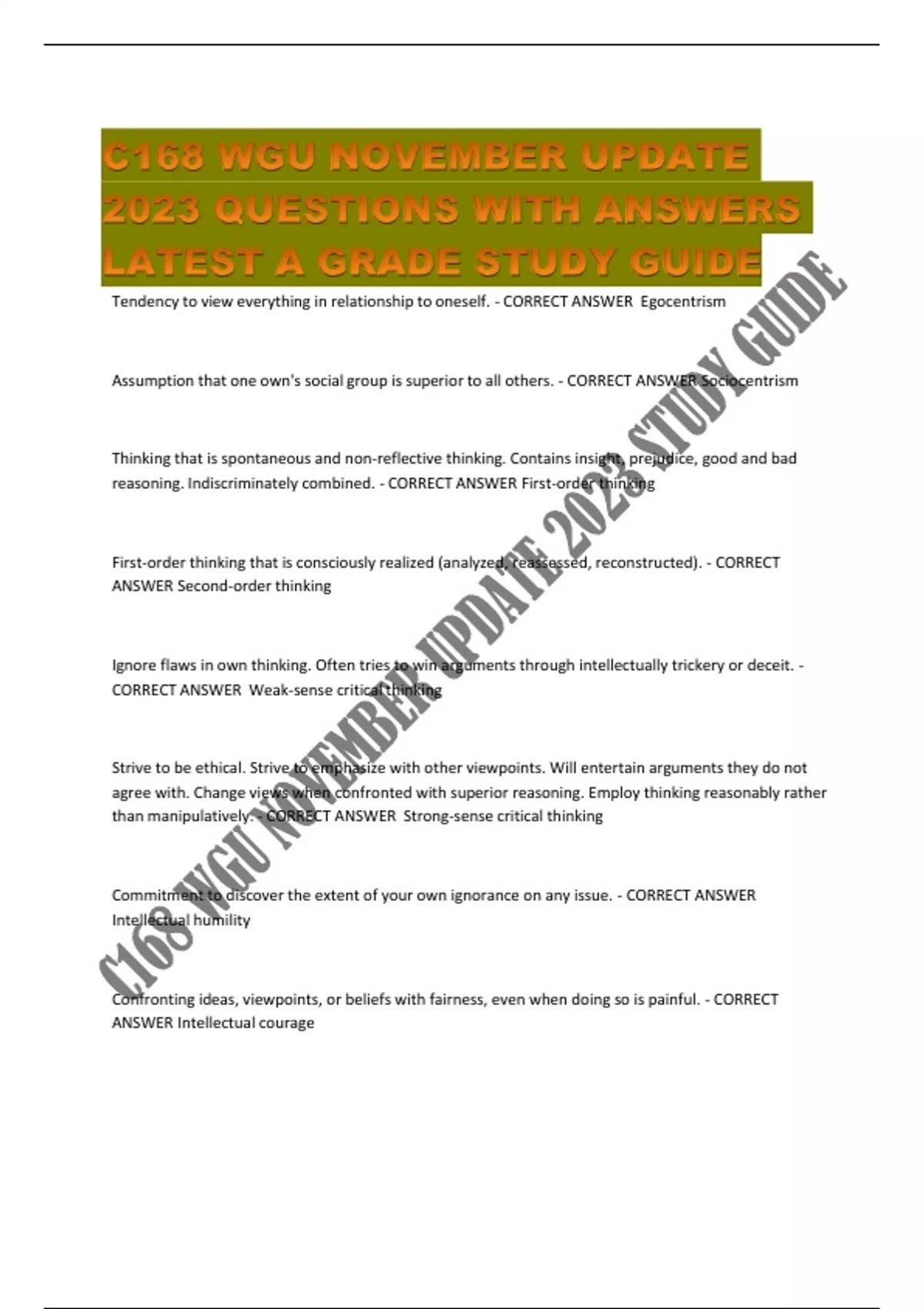 C168 WGU NOVEMBER UPDATE 2023 QUESTIONS WITH ANSWERS LATEST A GRADE STUDY GUIDE Tendency to view everything in relationship to oneself. - CORRECT ANSWER Egocentrism Assumption that one own's social group is superior to all others. - CORRECT ANSWER Sociocentrism Thinking that is spontaneous and non-reflective thinking. Contains insight, prejudice, good and bad reasoning. Indiscriminately combined. - CORRECT ANSWER First-order thinking First-order thinking that is consciously realized (analyzed, reassessed, reconstructed). - CORRECT ANSWER Second-order thinking Ignore flaws in own thinking. Often tries to win arguments through intellectually trickery or deceit. - CORRECT ANSWER Weak-sense critical thinking Strive to be ethical. Strive to emphasize with other viewpoints. Will entertain arguments they do not agree with. Change views when confronted with superior reasoning. Employ thinking reasonably rather than manipulatively. - CORRECT ANSWER Strong-sense critical thinking Commitment to discover the extent of your own ignorance on any issue. - CORRECT ANSWER Intellectual humility Confronting ideas, viewpoints, or beliefs with fairness, even when doing so is painful. - CORRECT ANSWER Intellectual courage Inhabiting perspectives of others in order to genuinely understand them. - CORRECT ANSWER Intellectual empathy Holding oneself to the same rigorous intellectual standards that one expects others to meet - CORRECT ANSWER Intellectual integrity Working one's way through intellectual complexities despite frustrations inherent in doing so - CORRECT ANSWER Intellectual perseverance Proceeds from the belief that both the individual's and society's interests are best served by unfettered reason - CORRECT ANSWER Confidence in reason Thinking of oneself while adhering to standards of rationality - CORRECT ANSWER Intellectual autonomy Thinking, feeling, and wanting - CORRECT ANSWER Three functions of the mind Ability to win an argument regardless of flaws in its reasoning - CORRECT ANSWER Soohistry Determines how many other viewpoints are being taken in to consideration and how many perspectives are being looked at for a problem. - CORRECT ANSWER Breadth Implications. - CORRECT ANSWER What is said to follow from our reasoning? Concepts. - CORRECT ANSWER Theories are examples of what? C - CORRECT ANSWER In reasoning we make based on . A. Assumptions/Inferences