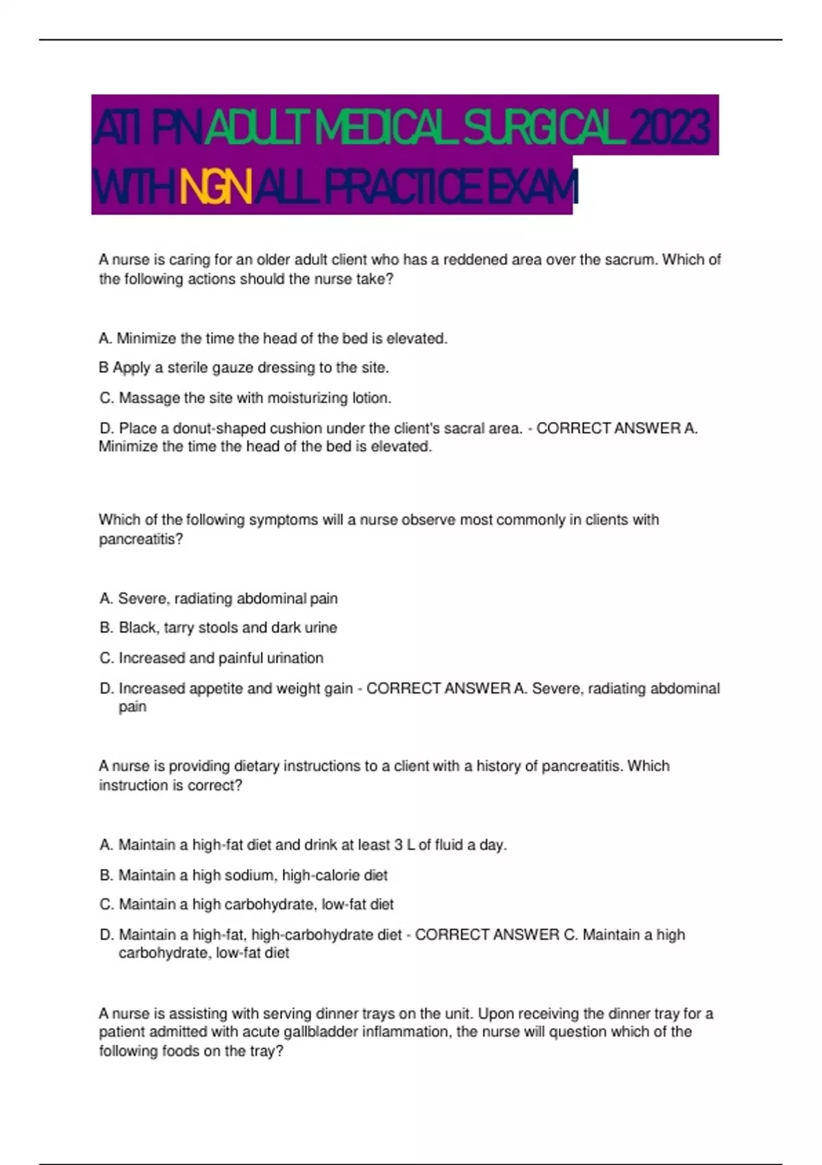 ATI PN ADULT MEDICAL SURGICAL 2023 WITH NGN ALL PRACTICE EXAM A nurse is caring for an older adult client who has a reddened area over the sacrum. Which of the following actions should the nurse take? A. Minimize the time the head of the bed is elevated. B Apply a sterile gauze dressing to the site. C. Massage the site with moisturizing lotion. D. Place a donut-shaped cushion under the client's sacral area. - CORRECT ANSWER A. Minimize the time the head of the bed is elevated. Which of the following symptoms will a nurse observe most commonly in clients with pancreatitis? A. Severe, radiating abdominal pain B. Black, tarry stools and dark urine C. Increased and painful urination D. Increased appetite and weight gain - CORRECT ANSWER A. Severe, radiating abdominal pain A nurse is providing dietary instructions to a client with a history of pancreatitis. Which instruction is correct? A. Maintain a high-fat diet and drink at least 3 L of fluid a day. B. Maintain a high sodium, high-calorie diet C. Maintain a high carbohydrate, low-fat diet D. Maintain a high-fat, high-carbohydrate diet - CORRECT ANSWER C. Maintain a high carbohydrate, low-fat diet A nurse is assisting with serving dinner trays on the unit. Upon receiving the dinner tray for a patient admitted with acute gallbladder inflammation, the nurse will question which of the following foods on the tray? A. Fried chicken B. Mashed potatoes C. Dinner roll D. Tapioca pudding - CORRECT ANSWER A. Fried chicken A nurse is caring for a patient with liver failure and is performing an assessment in the knowledge of the patients increased risk of bleeding. The nurse recognizes that this risk is related to the patients inability to synthesize prothrombin in the liver. What factor most likely contributes to this loss of function? A. Alterations in glucose metabolism B. Retention of bile salts C. Inadequate production of albumin by hepatocytes D. Inability of the liver to use vitamin K - CORRECT ANSWER D. Inability of the liver to use vitamin K Which of the following is a true statement regarding regional enteritis (Crohn's disease)? A. It has a progressive disease pattern B. It is characterized by lower left quadrant abdominal pain. C. The clusters of ulcers take on a cobble stone appearance. D. The lesions are in continuous contact with one another. - CORRECT ANSWER C. The clusters of ulcers take on a cobble stone appearance. A nurse is preparing to provide care for a patient whose exacerbation of ulcerative colitis has required hospital admission. During an exacerbation of this health problem, the nurse would anticipate that the patients stools will have what characteristics? A. Watery with blood and mucus B. Hard and black or tarry C. Dry and streaked with blood D. Loose with visible fatty streaks - CORRECT ANSWER A. Watery with blood and mucus What is the cause of a 'non-mechanical' bowel obstruction? A. A tumor or twisting of the bowel B. Constipation. C. General anesthesia, narcotics, and handling of the bowel during surgery. D. Adhesions - CORRECT ANSWER C. General anesthesia, narcotics, and handling of the bowel during surgery. What should the nurse advise a pt. who has diverticulosis to eat? A. High fiber foods. B. Low fiber foods. C. Low carb foods. D. High carb foods - CORRECT ANSWER A. High fiber foods. What should the nurse advise a pt. who has diverticulitis to eat? A. High fiber foods. B. Low fiber foods. C. Low carb foods. D. High carb foods - CORRECT ANSWER B. Low fiber foods. Which of the following is an appropriate nursing intervention for a patient who has had an EGD? A. Give food and water as soon as the test is completed. B. Enemas until clear. C. Monitor for hemorrhage r/t organ perforation. D. Administer a sedative. - CORRECT ANSWER C. Monitor for hemorrhage r/t organ perforation. Which of the following is an appropriate nursing intervention for a pt. who has GERD? A. Advise pt. to remain upright after meals. B. Withhold fluids during meal time. C. Administer the appropriate immunoglobulin. D. Give the prescribed steroids with half a glass of milk. - CORRECT ANSWER A. Advise pt. to remain upright after meals. Which of the following is a priority for a pt. who is hemorrhaging from a perforated duodenal ulcer? A. Administer the sedative prior to the PY test. B. Monitor for shock. C. Position the pt. on his back with a pillow under his right ribs and his right hand under his head. D. Guiac his stool - CORRECT ANSWER B. Monitor for shock. Which of the following is an appropriate nursing intervention for a pt. who has gastritis? A. Lavage the NG tube with iced saline. B. Give sucralfate with meals and follow it with antacids. C. Advise the pt. to avoid irritating foods such as spicy foods. D. Advise the pt. to drink milk every two hours. - CORRECT ANSWER C. Advise the pt. to avoid irritating foods such as spicy foods. Which of the following is an appropriate nursing intervention for a pt. who has an inguinal hernia? A. Turn, cough, & deep breath every hour while awake to prevent pneumonia. B. Avoid prolonged standing. C. Decrease fiber intake to control diarrhea. D. Monitor your stools for occult blood. - CORRECT ANSWER B. Avoid prolonged standing. Which of the following should the nurse advise a pt who has ulcerative colitis to call the doctor for? A. Occasional abdominal cramping B. Nine mucous bloody stools per day. C. Signs of colon perforation and peritonitis. D. Diarrhea. - CORRECT ANSWER C. Signs of colon perforation and peritonitis