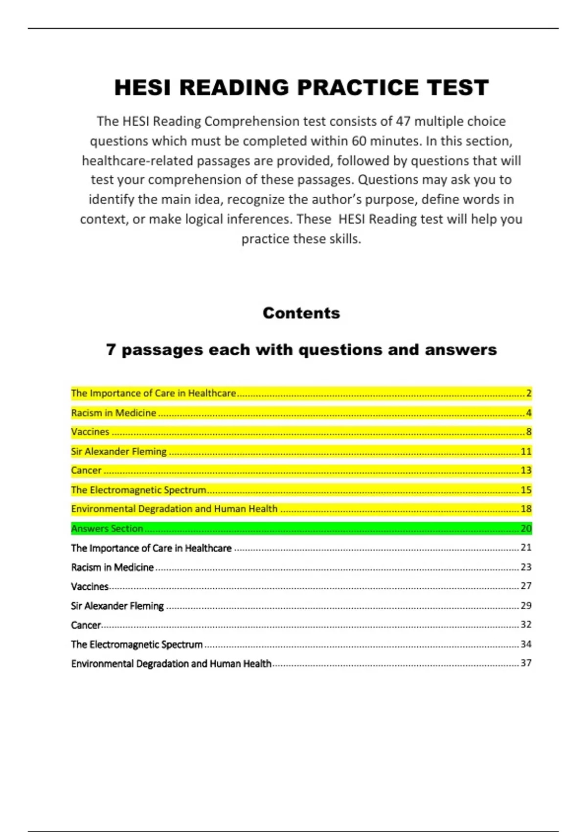 HESI A2 READING PRACTICE TEST COMPRISING 7 PASSAGES EACH WITH QUESTIONS AND ANSWERS The HESI Reading Comprehension test consists of 47 multiple choice questions which must be completed within 60 minutes. In this section, healthcare-related passages are provided, followed by questions that will test your comprehension of these passages. Questions may ask you to identify the main idea, recognize the author’s purpose, define words in context, or make logical inferences. These HESI Reading test will help you practice these skills.