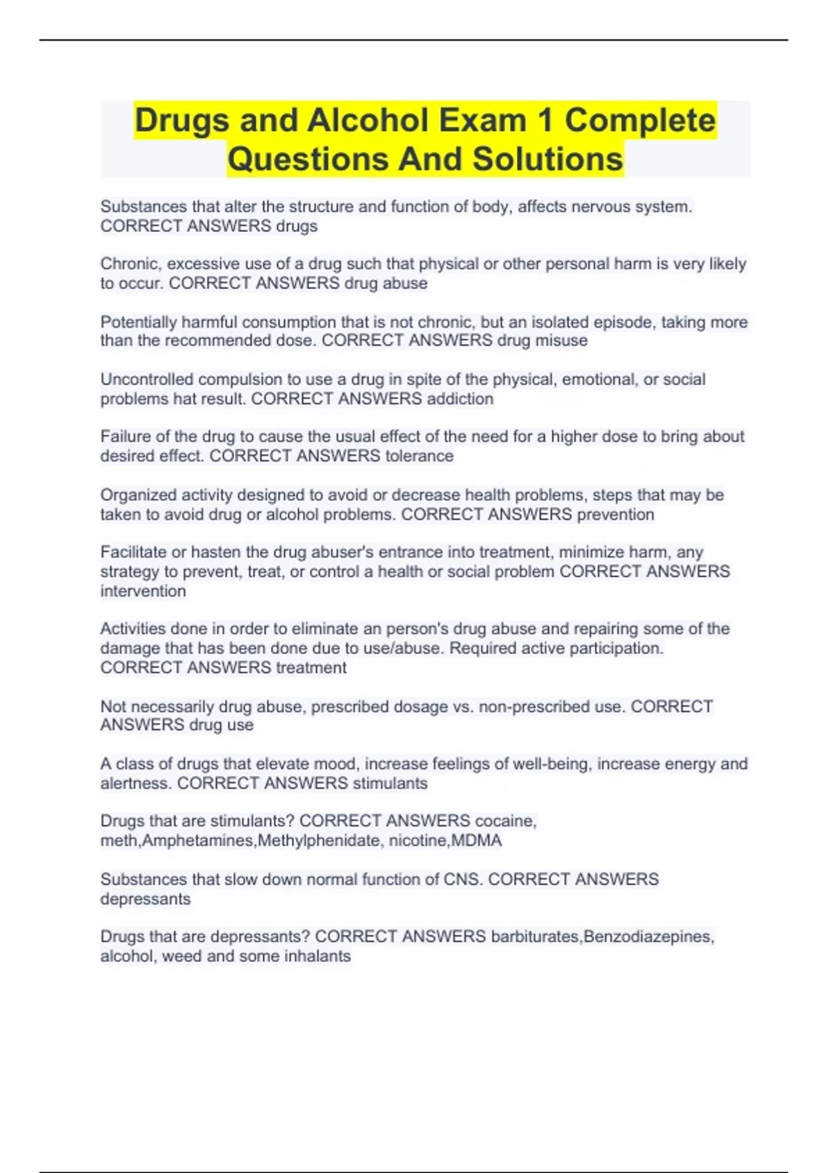 Drugs and Alcohol Exam 1 Complete Questions And Solutions.