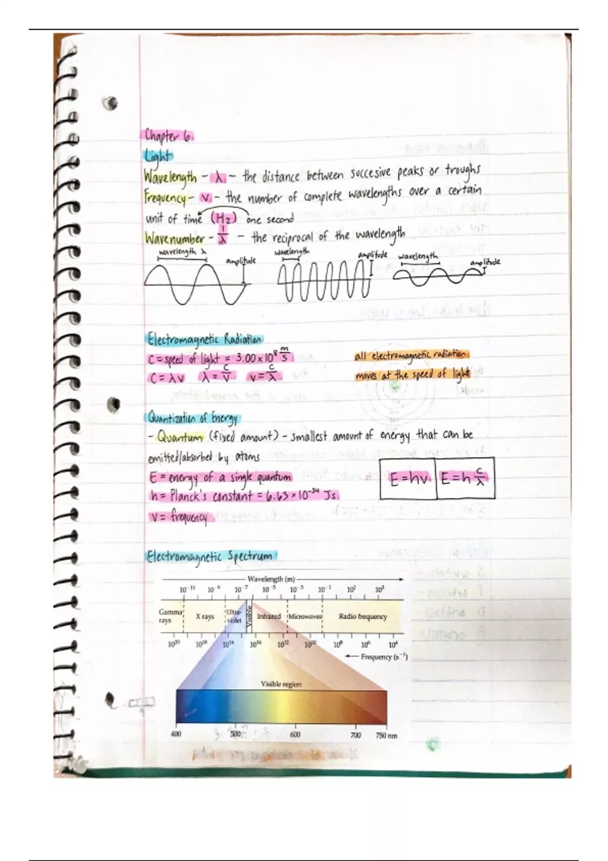 Chapters 6 & 7 of Intro to Chem 1 at App State (CHE1101) taught by Dr. Wijesinghe. These chapters cover light, radiation, the photoelectric effect, energy orbitals, electron configuration, quantum numbers, electron rules and principles, atomic radius, electronegativity, and ionization energy. Some images/definitions are not entirely my own; credit for any work that is not mine goes to its rightful owners.