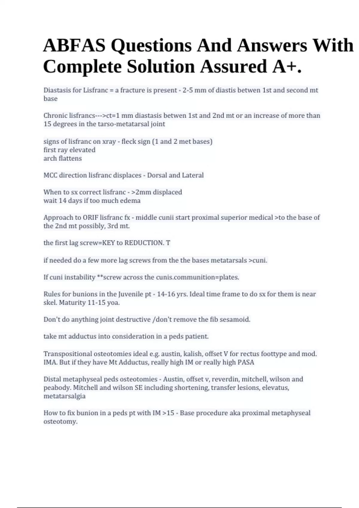 ABFAS Questions And Answers With Complete Solution Assured A+. Diastasis for Lisfranc = a fracture is present - 2-5 mm of diastis betwen 1st and second mt base Chronic lisfrancs--->ct=1 mm diastasis betwen 1st and 2nd mt or an increase of more than 15 degrees in the tarso-metatarsal joint signs of lisfranc on xray - fleck sign (1 and 2 met bases) first ray elevated arch flattens MCC direction lisfranc displaces - Dorsal and Lateral When to sx correct lisfranc - >2mm displaced wait 14 days if too much edema Approach to ORIF lisfranc fx - middle cunii start proximal superior medical >to the base of the 2nd mt possibly, 3rd mt. the first lag screw=KEY to REDUCTION. T if needed do a few more lag screws from the the bases metatarsals >cuni. If cuni instability **screw across the nition=plates. Rules for bunions in the Juvenile pt - 14-16 yrs. Ideal time frame to do sx for them is near skel. Maturity 11-15 yoa. Don't do anything joint destructive /don't remove the fib sesamoid. take mt adductus into consideration in a peds patient. Transpositional osteotomies ideal e.g. austin, kalish, offset V for rectus foottype and mod. IMA. But if they have Mt Adductus, really high IM or really high PASA Distal metaphyseal peds osteotomies - Austin, offset v, reverdin, mitchell, wilson and peabody. Mitchell and wilson SE including shortening, transfer lesions, elevatus, metatarsalgia How to fix bunion in a peds pt with IM >15 - Base procedure aka proximal metaphyseal osteotomy. ABFAS Questions And Answers With Complete Solution Assured A+. -closed or open base wedge, cresentic procedure, lapidus =goal to make first and 2nd mt parallel without damaging the open physeal plate. base of proximal phalanx (aka proximal akin) of hallux what does it correct - Distal Angle DASA Fix pasa with mt head osteotomy like REVERDIN=lat cortex intact proximal cut parallel to 1st mt and distal cut parallel to articular surface Fix DASA W/ proximal akin disadvantage of the fusion vs plasty is the - fusion has less hallux propulsion and it can shorten which can then lead to contracture of the ehl or fhl You can walk it immediately vs plasty you cant cancellous vs cortical screws - Cannulated cancellous screws are used for metaphyseal fractures while cannulated and noncannulated cortical screws are used as lag screws for fixation of diaphyseal fractures. The main advantage of cannulated screws is that they can be inserted over a guide wire or guide pin. The diameter of the guide pin is much smaller than the cannulated screw Cannulated screws have a hollow central shaft. Both cortical and cancellous screws can be cannulated. 1st MPJ arthrodesis position - neutral rotation of the hallux, 10-15 degrees of valgus 20-30 degrees of dorsiflexion in reference to the axis of the first metatarsal Which does not affect bone healing: 1. Nutritional status, Rheumatoid or methotrexate patient, DM, tobacco hx, extent of initial injury, osteoporosis, other metabolic diseases, neuropathy - all do mcc for ex fix - 1. m/c complications involve bone healing and not infection others: 1. delayed, nonunion, implant loosening, fracture, chronic pain, soft tissue inflammation, ulceration, or gross infection including osteomyelitis blood supply to talus - rior tibial artery, artery of the tarsal canal dorsalis pedis artery, perforating peroneal artery. MCC of talar AVN - post-traumatic talar fracture Pain, swelling, with a history of previous injury or trauma. May have mechanical symptoms such as clicking, locking, or grinding. - AVN diagnose by a. Plain XR and MRI remain the most used and beneficial modalities. Classification of AVN - i. Hawkins type I fractures are non displaced vertical neck fractures. AVN is 10%. ii. Hawkins type II fractures consist of a vertical talar neck fracture with either subluxation or displacement of the STJ. AVN is 42%. iii. Hawkins type 3 fractures are characterized by a vertical talar neck fracture with subluxation or dislocation of both the ankle and STJs. AVN 91%. iv. Hawkins type IV fractures vertical talar neck fracture with subluxation or dislocation of the ankle, STJ, and the TNJ. AVN of 100%. what is Hawkins sign - AVN=Hawkins sign: subchondral radiolucent line along the superior aspect of the talar dome, which classically begins on the medial side of the talar dome, and appears 6-8 weeks after injury. indicative of talar revascularization; seen on AP or mortise view. MRI presentation of AVN - i. MRI is the most widely used modality to dx and potentially prevent further talar damage due to AVN. a. Normal T1 images will show a strong SI due to bone marrow elements in trabecular bone. b. In early AVN, diffuse marrow edema produces low signal intensity on T1 images and high SI on T2. c. In advanced stages, the diagnosis of AVN on MRI includes decreased SI on both T1 and T2 weighted images indicative of areas of devascularization or necrotic bone. Why perform arthroscopy for AVN - a. Arthroscopic Debridement and Core Decompression: i. Rationale: Thought to enhance revascularization and decrease intraosseous pressure. 1. Indicated in treatment of F&A stages I and II (partial AVN and those without collapse). ii. Technique: Standard AM and AL portals used for arthroscopy with a lateral sinus tarsi (lateral process) approach for retrograde drilling. post op avn sx - Posterior splint until sutures removed followed by NWB cast for 4 weeks. 1. 5-6 weeks PO, patient placed into a patellar tendon WB boot walker or brace but still kept strictly NWB (NWB ROM exercises started). 2. 8 weeks PO, XR are taken and the integrity of the talus is judged, PWB allowed on the PTB boot and as healing continues WB is progressed. Patient is then in rigid AFO for the first 6 months. types of Bone Grafts for Talar AVN - 1. Nonvascularized cancellous autograft can be taken from the iliac crest, calcaneus, or femoral head. Useful only in small, contained defects since this does not supply structural support. 2. Vascularized pedicle autograft: Rati