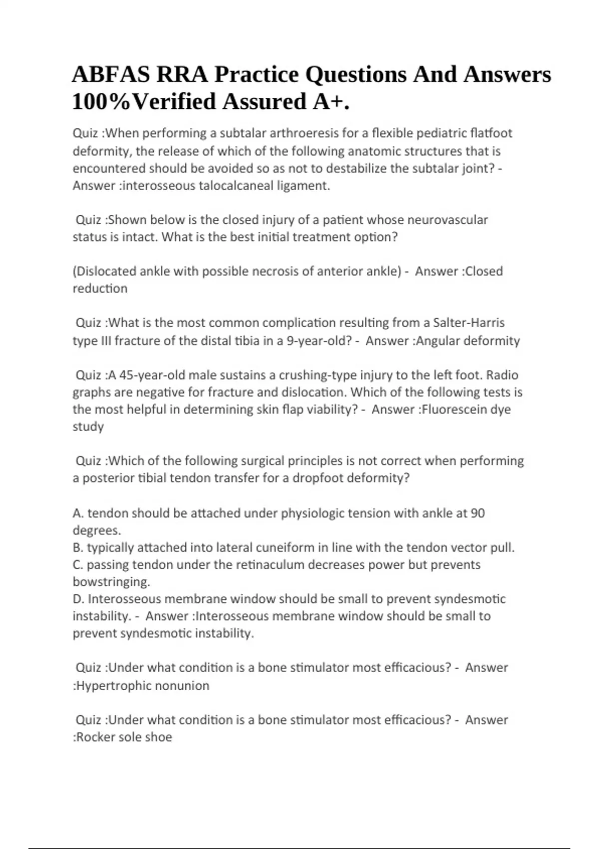 ABFAS RRA Practice Questions And Answers 100%Verified Assured A+. Quiz :When performing a subtalar arthroeresis for a flexible pediatric flatfoot deformity, the release of which of the following anatomic structures that is encountered should be avoided so as not to destabilize the subtalar joint? - Answer :interosseous talocalcaneal ligament. Quiz :Shown below is the closed injury of a patient whose neurovascular status is intact. What is the best initial treatment option? (Dislocated ankle with possible necrosis of anterior ankle) - Answer :Closed reduction Quiz :What is the most common complication resulting from a Salter-Harris type III fracture of the distal tibia in a 9-year-old? - Answer :Angular deformity Quiz :A 45-year-old male sustains a crushing-type injury to the left foot. Radio graphs are negative for fracture and dislocation. Which of the following tests is the most helpful in determining skin flap viability? - Answer :Fluorescein dye study Quiz :Which of the following surgical principles is not correct when performing a posterior tibial tendon transfer for a dropfoot deformity? A. tendon should be attached under physiologic tension with ankle at 90 degrees. B. typically attached into lateral cuneiform in line with the tendon vector pull. C. passing tendon under the retinaculum decreases power but prevents bowstringing. D. Interosseous membrane window should be small to prevent syndesmotic instability. - Answer :Interosseous membrane window should be small to prevent syndesmotic instability.
