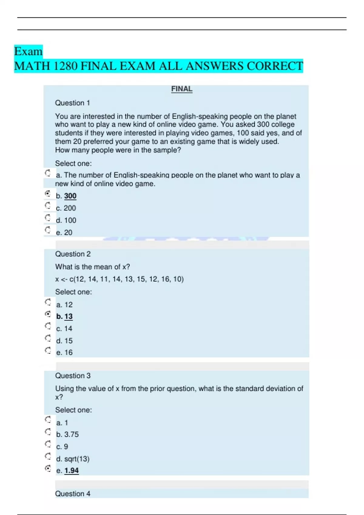 Exam MATH 1280 FINAL EXAM ALL ANSWERS CORRECT