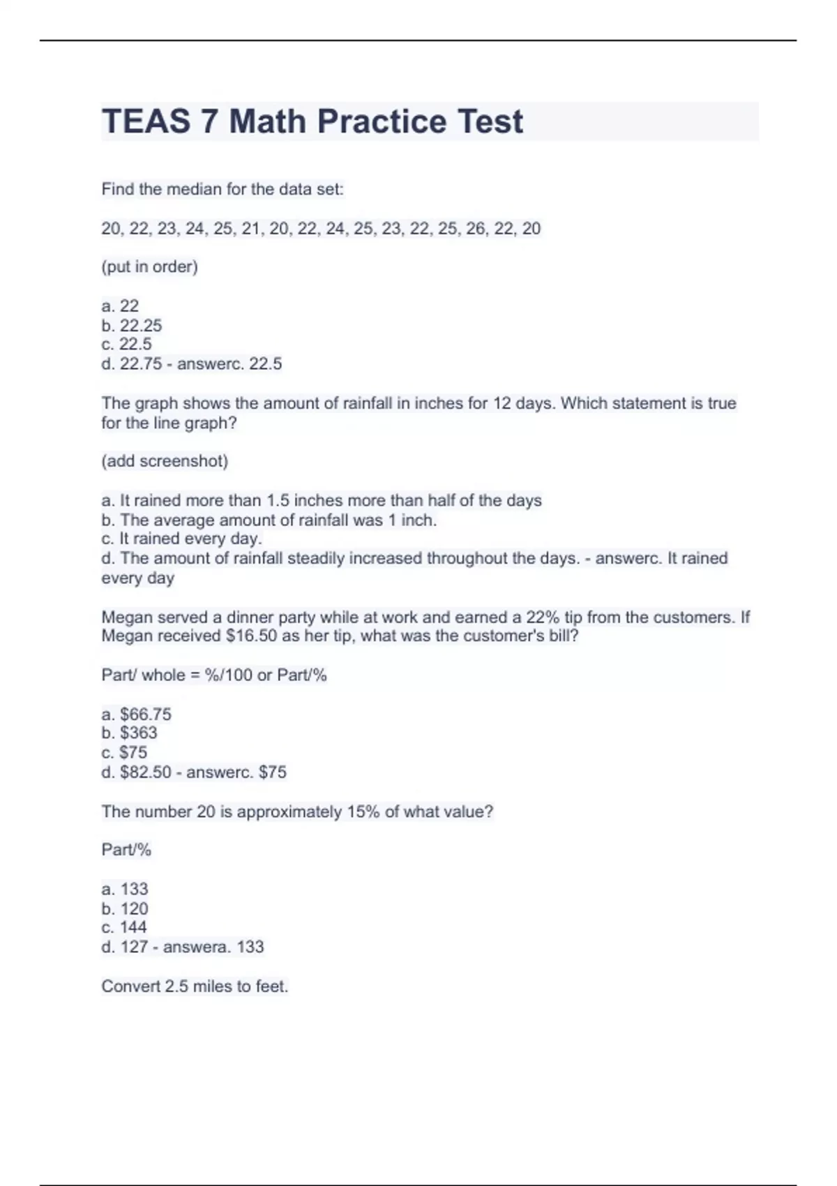 TEAS 7 Math Practice Test.Questions and answers are graded A+