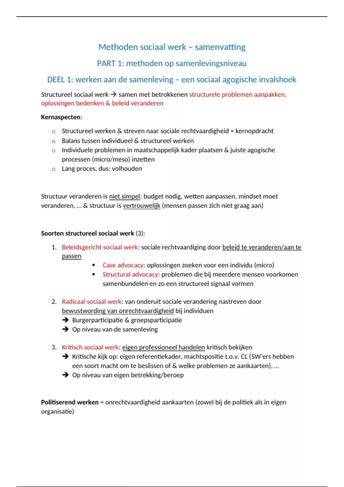 o Community work = samenwerken om mensen te betrekken & verandering te