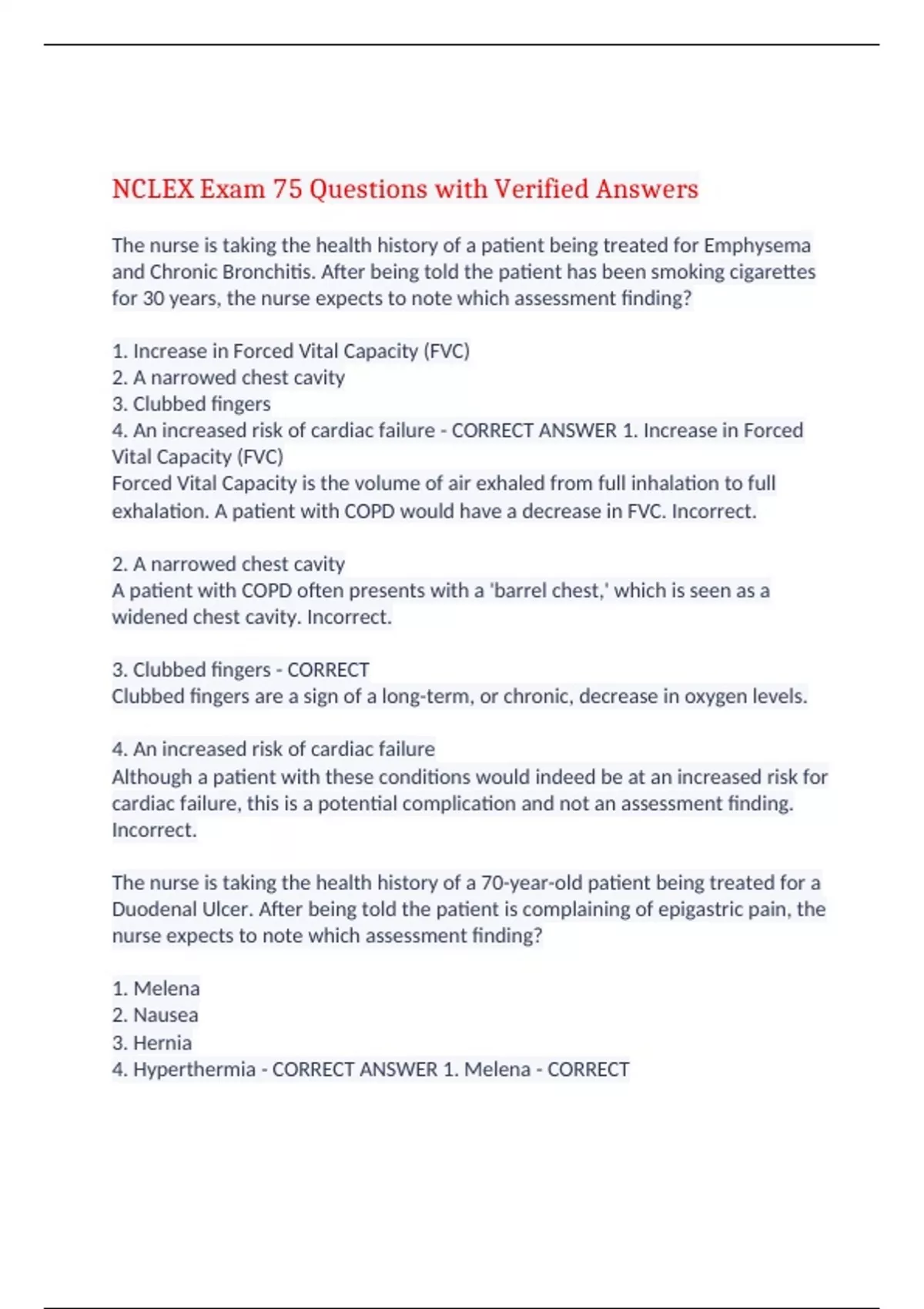 NCLEX Exam 75 Questions with Verified Answers The nurse is taking the health history of a patient being treated for Emphysema and Chronic Bronchitis. After being told the patient has been smoking cigarettes for 30 years, the nurse expects to note which assessment finding? 1. Increase in Forced Vital Capacity (FVC) 2. A narrowed chest cavity 3. Clubbed fingers 4. An increased risk of cardiac failure - CORRECT ANSWER 1. Increase in Forced Vital Capacity (FVC) Forced Vital Capacity is the volume of air exhaled from full inhalation to full exhalation. A patient with COPD would have a decrease in FVC. Incorrect. 2. A narrowed chest cavity A patient with COPD often presents with a 'barrel chest,' which is seen as a widened chest cavity. Incorrect. 3. Clubbed fingers - CORRECT Clubbed fingers are a sign of a long-term, or chronic, decrease in oxygen levels. 4. An increased risk of cardiac failure Although a patient with these conditions would indeed be at an increased risk for cardiac failure, this is a potential complication and not an assessment finding. Incorrect. The nurse is taking the health history of a 70-year-old patient being treated for a Duodenal Ulcer. After being told the patient is complaining of epigastric pain, the nurse expects to note which assessment finding? 1. Melena 2. Nausea 3. Hernia 4. Hyperthermia - CORRECT ANSWER 1. Melena - CORRECT Melena is the finding that there are traces of blood in the stool which presents as black, tarry feces. This is a common manifestation of Duodenal Ulcers, since the Duodenum is further down the gastric anatomy. 2. Nausea Nausea may be present, but is a generalized symptom and by itself doesn't indicate a Duodenal Ulcer. Incorrect. 3. Hernia A Hernia is a protrusion of a segment of the abdomen through another abdominal structure. It is not associated with an Ulcer and is a condition, not an assessment finding. Incorrect. 4. Hyperthermia Hyperthermia, a high temperature, is not an assessment finding of a Duodenal Ulcer. Incorrect A nurse is providing discharge teaching for a patient with severe Gastroesophogeal Reflux Disease. Which of these statements by the patient indicates a need for more teaching? 1. "I'm going to limit my meals to 2-3 per day to reduce acid secretion." 2. "I'm going to make sure to remain upright after meals and elevate my head when I sleep" 3. "I won't be drinking tea or coffee or eating chocolate any more." 4. "I'm going to start trying to lose some weight." - CORRECT ANSWER 1. "I'm going to limit my meals to 2-3 per day to reduce acid secretion." CORRECT - Large meals increase the volume and pressure in the stomach and delay gastric emptying. It's recommended instead to eat 4-6 small meals a day. 2. "I'm going to make sure to remain upright after meals and elevate my head when I sleep" Incorrect - This is a correct verbalization of health promotion for GERD. 3. "I won't be drinking tea or coffee or eating chocolate any more." Incorrect - This is a correct verbalization of health promotion for GERD. 4. "I'm going to start trying to lose some weight." Incorrect - This is a correct verbalization of health promotion for GERD. The nurse in the Emergency Room is treating a patient suspected to have a Peptic Ulcer. On assessing lab results, the nurse finds that the patient's blood pressure is 95/60, pulse is 110 beats per minute, and the patient reports epigastric pain. What is the PRIORITY intervention? 1. Start a large-bore IV in the patient's arm 2. Ask the patient for a stool sample 3. Prepare to insert an NG Tube 4. Administer intramuscular morphine sulphate as ordered - CORRECT ANSWER 1. Start a large-bore IV in the patient's arm CORRECT - The nurse should suspect that the patient is haemorrhaging and will need need a fluid replacement therapy, which requires a large bore IV. 2. Ask the patient for a stool sample Incorrect - While this is useful in the diagnosis and assessment of Peptic Ulcer Disease, it is not the priority intervention. 3. Prepare to insert an NG Tube Incorrect - While this intervention may be used in the later stages of Peptic Ulcer Disease, it is not the first and priority intervention. 4. Administer intramuscular morphine sulphate as ordered Incorrect - While this is an important intervention to manage pain, it is not the priority intervention. A female patient with atrial fibrillation has the following lab results: Hemoglobin of 11 g/dl, a platelet count of 150,000, an INR of 2.5, and potassium of 2.7 mEq/L. Which result is critical and should be reported to the physician immediately? 1. Hemoglobin 11 g/dl 2. Platelet of 150,000 3. INR of 2.5 4. Potassium of 2.7 mEq/L - CORRECT ANSWER 1. Hemoglobin 11 g/dl This is below normal, but a normal female hemoglobin is 12-14. There is a more critical lab result. 2. Platelet of 150,000 This is also below the normal values, but is not the most critical lab result. 3. INR of 2.5 This is a therapeutic range for a patient who is taking an anticoagulant for atrial fibrillation 4. Potassium of 2.7 mEq/L CORRECT - A potassium imbalance for a patient with a history of dysrhythmia can be life-threatening and can lead to cardiac distress. While receiving normal saline infusions to treat a GI bleed, the nurse notes that the patient's lower legs have become edematous and auscultates crackles in the lungs. What should the nurse do first? 1. Stop the saline infusion immediately 2. Notify Physician 3. Elevate the patient's legs 4. Continue the infusion, since these are normal findings - CORRECT ANSWER 1. Stop the saline infusion immediately CORRECT - the patient has a fluid volume overload as a result of overly rapid fluid replacement. The nurse should stop the infusion and notify the physician. 2. Notify Physician This is not the first action the nurse should take. 3. Elevate the patient's legs This would help with the edema, but is not a priority 4. Continue the infusion, since these are normal findings This is not a normal finding The nurse is working in a support 