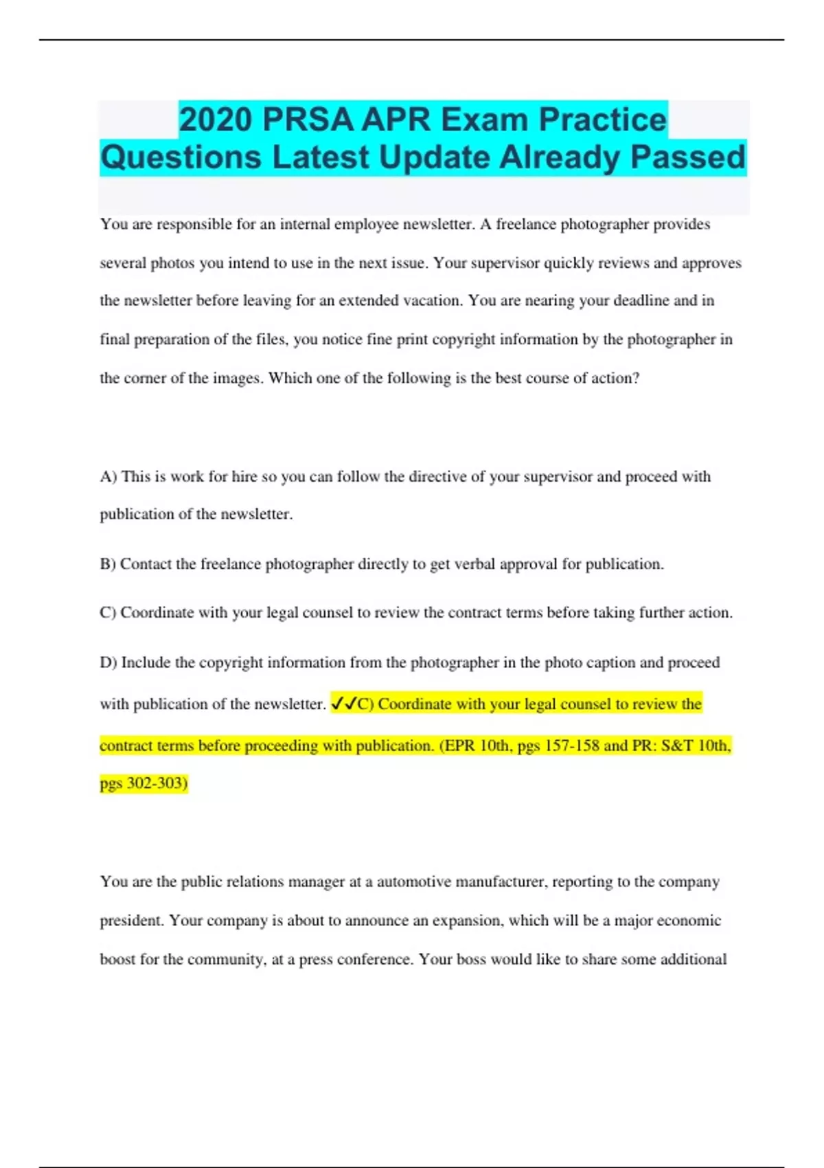 2020 PRSA APR Exam Practice Questions Latest Update Already Passed You are responsible for an internal employee newsletter. A freelance photographer provides several photos you intend to use in the next issue. Your supervisor quickly reviews and approves the newsletter before leaving for an extended vacation. You are nearing your deadline and in final preparation of the files, you notice fine print copyright information by the photographer in the corner of the images. Which one of the following is the best course of action? A) This is work for hire so you can follow the directive of your supervisor and proceed with publication of the newsletter. B) Contact the freelance photographer directly to get verbal approval for publication. C) Coordinate with your legal counsel to review the contract terms before taking further action. D) Include the copyright information from the photographer in the photo caption and proceed with publication of the newsletter. C) Coordinate with your legal counsel to review the contract terms before proceeding with publication. (EPR 10th, pgs 157-158 and PR: S&T 10th, pgs 302-303) You are the public relations manager at a automotive manufacturer, reporting to the company president. Your company is about to announce an expansion, which will be a major economic boost for the community, at a press conference. Your boss would like to share some additional details about the acquisition "off the record" with several community partners following the press conference at a VIP event, which some media may attend. What counsel would you offer your boss? 1. We trust our partners and this will improve our community relations 2. It is acceptable to share these details if we inform the audience that what we share is off the record 3. It is acceptable to share these details if reporters do not attend the event 4. You should never share things off the record unless you really want it t get out 4. You should never share things off the record unless you really want it t get out (EPR p.231) Which of the following two statements are correct in order for you to use these photos in ads? A. The company hired and paid the photographer for the professional event photos and owns them for future use. B. These photos can only be used if the photographer has provided written permission to reproduce the event photos beyond the original purpose of an internal newsletter. C.The employees and family members photographed must have a signed consent release to have their photos used in an ad for the company. D. Company employees are not required to sign releases, but their family members would need to have signed releases to be used in the ads B. These photos can only be used if the photographer has provided written permission to reproduce the event photos beyond the original purpose of an internal newsletter. C.The employees and family members photographed must have a signed consent release to have their photos used in an ad for the company. Reference: Public Relations Strategies and Tactics (10th ed): Page 298: Photo Releases and Page 302: Photography and Artwork. As the internal communications officer of a large corporation, You've discovered numerous unofficial newsletters being published and emailed to 3,000 employees without your knowledge. On further investigation you discover in each newsletter a national ad appeared with the copyright symbol listed, but with digital modifications made to each ad changing the color and size. What three significant copyright laws were violated here? A. Downloading materials from the Internet, Fair Use, and Statutory Copyright B. Product Publicity, Photography & Artwork, Copyright Act D. Common law copyright, Fair Use Doctrine, and Infringement E. Trademark Infringement, Digital Millennium Copyright Act (DMCA), and Copyright Infringement. E. Trademark, Digital Millennium Copyright Act (DMCA), and Copyright Law. (APR