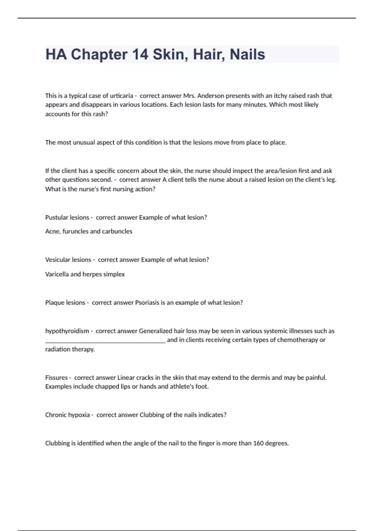This is a typical case of urticaria - correct answer Mrs. Anderson presents with an itchy raised rash that appears and disappears in various locations. Each lesion lasts for many minutes. Which most likely accounts for this rash? The most unusual aspect of this condition is that the lesions move from place to place. If the client has a specific concern about the skin, the nurse should inspect the area/lesion first and ask other questions second. - correct answer A client tells the nurse about a raised lesion on the client's leg. What is the nurse's first nursing action? Pustular lesions - correct answer Example of what lesion? Acne, furuncles and carbuncles Vesicular lesions - correct answer Example of what lesion? Varicella and herpes simplex Plaque lesions - correct answer Psoriasis is an example of what lesion? hypothyroidism - correct answer Generalized hair loss may be seen in various systemic illnesses such as ___________________________________ and in clients receiving certain types of chemotherapy or radiation therapy. Fissures - correct answer Linear cracks in the skin that may extend to the dermis and may be painful. Examples include chapped lips or hands and athlete's foot. Chronic hypoxia - correct answer Clubbing of the nails indicates? Clubbing is identified when the angle of the nail to the finger is more than 160 degrees. 50 years - correct answer The risk for melanoma is increased in people older than? Tinea corporis (ring worm) - correct answer A 4-year-old child presents to the health care clinic with circular lesions. Which of the following conditions should the nurse most suspect in this client, based on the configuration of the lesions? The apocrine glands - correct answer Are found chiefly in the axillary and genital regions, usually open into hair follicles, and are stimulated by emotional stress. This type of gland does not secret on locations identified by the other options. Dermis - correct answer Well-vascularized, connective tissue layer containing collagen and elastic fibers, nerve endings, and lymph vessels. It is also the origin of sebaceous glands, sweat glands, and hair follicles. The epidermis - correct answer Composed of four distinct layers: the stratum corneum, stratum lucidum, stratum granulosum, and stratum germinativum. The outermost layer consists of dead, keratinized cells that render the skin waterproof. Ashen - correct answer To assess for anemia in a dark-skinned client, the nurse should observe the client's skin for a color that appears. Pallor (loss of color) is seen in arterial insufficiency, decreased blood supply, and anemia. Pallid tones vary from pale to ashen without underlying pink. Pulse oximetry A nail angle greater than 160 degrees indicates clubbing which is caused by chronic hypoxia. Measuring the client's pulse oximetry would be a priority. - correct answer The nurse notes that a client's nails are greater than a 160-degree angle. What should the nurse assess as a priority for this client? Vellus - correct answer Short, pale, and fine hair that is present over much of the body is termed