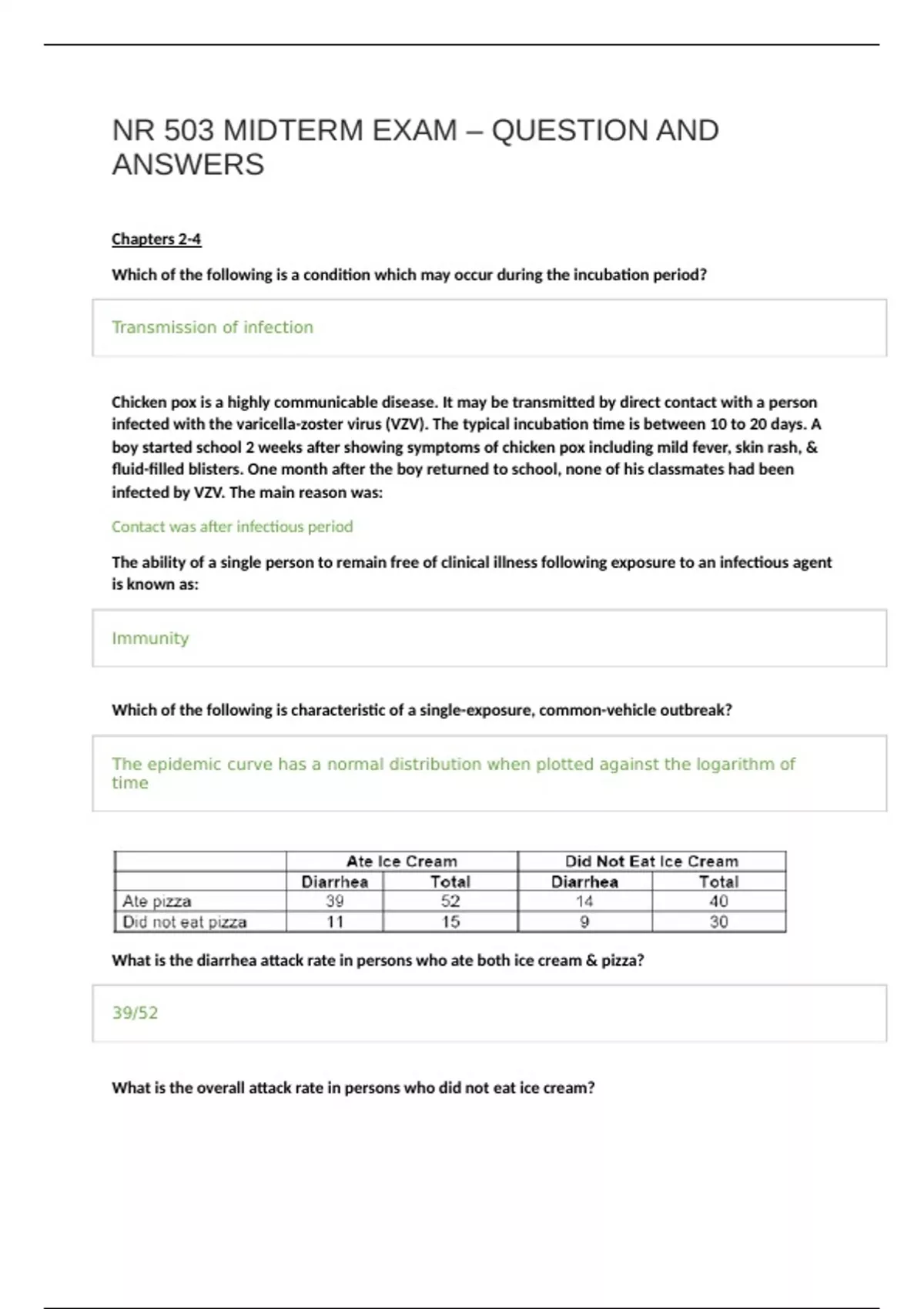 NR 503 MIDTERM EXAM – QUESTION AND ANSWERS ALL CHAPTERS INCLUDED Which of the following is a condition which may occur during the incubation period? Chicken pox is a highly communicable disease. It may be transmitted by direct contact with a person infected with the varicella-zoster vi...