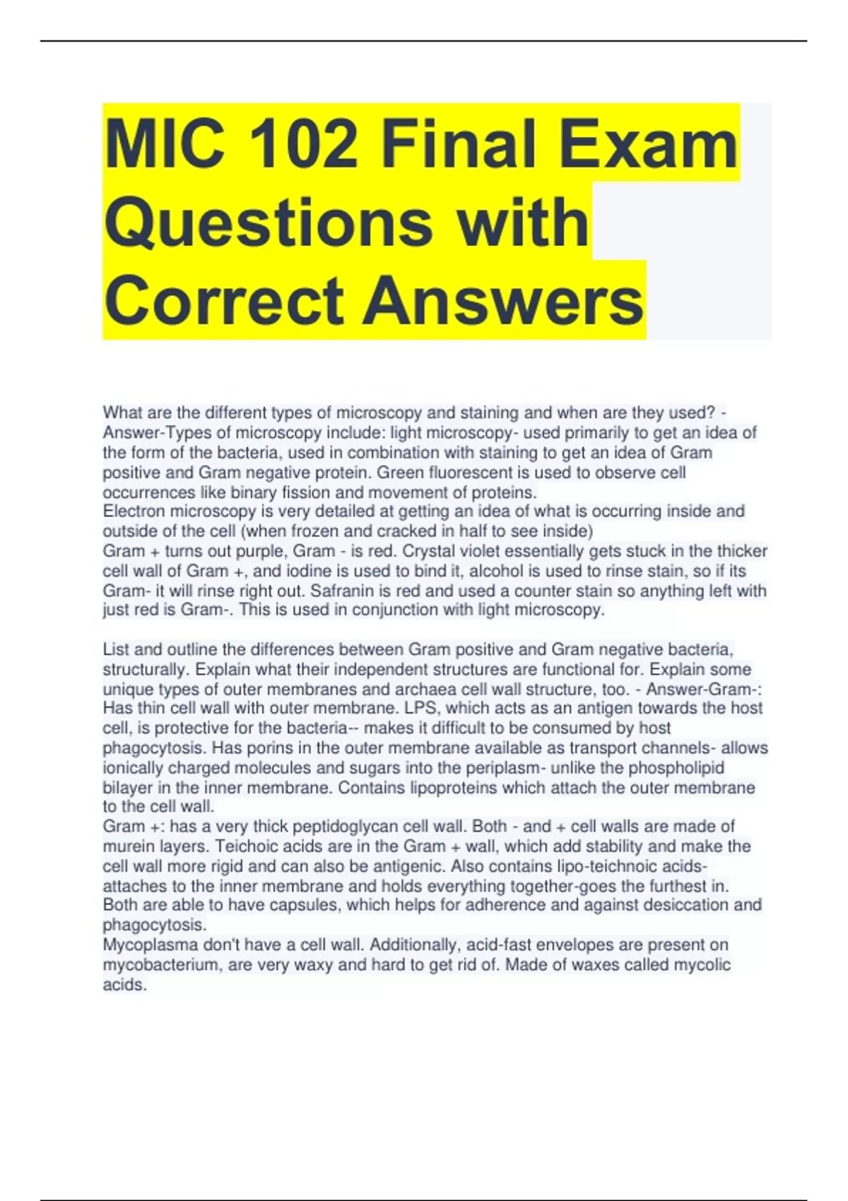 MIC 102 Final Exam Questions with Correct Answers What are the different types of microscopy and staining and when are they used? - Answer-Types of microscopy include: light microscopy- used primarily to get an idea of the form of the bacteria, used in combination with staining to get an idea of Gram positive and Gram negative protein. Green fluorescent is used to observe cell occurrences like binary fission and movement of proteins. Electron microscopy is very detailed at getting an idea of what is occurring inside and outside of the cell (when frozen and cracked in half to see inside) Gram + turns out purple, Gram - is red. Crystal violet essentially gets stuck in the thicker cell wall of Gram +, and iodine is used to bind it, alcohol is used to rinse stain, so if its Gram- it will rinse right out. Safranin is red and used a counter stain so anything left with just red is Gram-. This is used in conjunction with light microscopy. List and outline the differences between Gram positive and Gram negative bacteria, structurally. Explain what their independent structures are functional for. Explain some unique types of outer membranes and archaea cell wall structure, too. - Answer-Gram-: Has thin cell wall with outer membrane. LPS, which acts as an antigen towards the host cell, is protective for the bacteria-- makes it difficult to be consumed by host phagocytosis. Has porins in the outer membrane available as transport channels- allows ionically charged molecules and sugars into the periplasm- unlike the phospholipid bilayer in the inner membrane. Contains lipoproteins which attach the outer membrane to the cell wall. Gram +: has a very thick peptidoglycan cell wall. Both - and + cell walls are made of murein layers. Teichoic acids are in the Gram + wall, which add stability and make the cell wall more rigid and can also be antigenic. Also contains lipo-teichnoic acids- attaches to the inner membrane and holds everything together-goes the furthest in. Both are able to have capsules, which helps for adherence and against desiccation and phagocytosis. Mycoplasma don't have a cell wall. Additionally, acid-fast envelopes are present on mycobacterium, are very waxy and hard to get rid of. Made of waxes called mycolic acids. Archaea have a crystalline S-layer (sometimes bacteria have it). Its attached to the cell wall of the archaea- also made of monomers linked together to make crystalline plate. Helps surface adherence and is protective against other microbes and host defenses (for the archaea). Archaea have ether bond linkage instead of ester (like bacteria), and their cell walls made of isoprenoids which are functioning in place of lipoproteins. Isoprenoids have a different structure from fatty acids that makes them more stable at high temperatures.