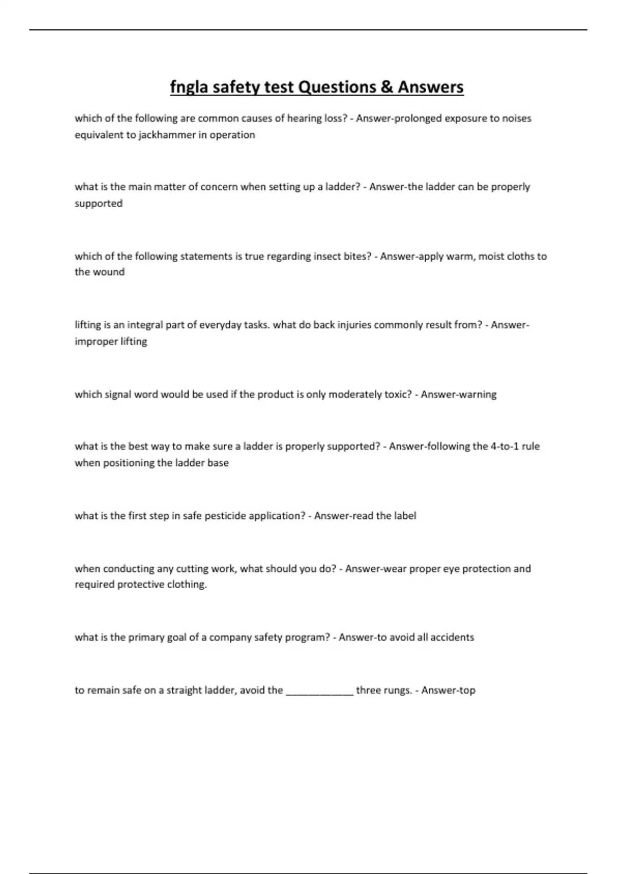 fngla safety test Questions & Answers which of the following are common causes of hearing loss? - Answer-prolonged exposure to noises equivalent to jackhammer in operation what is the main matter of concern when setting up a ladder? - Answer-the ladder can be properly supported which of the following statements is true regarding insect bites? - Answer-apply warm, moist cloths to the wound lifting is an integral part of everyday tasks. what do back injuries commonly result from? - Answerimproper lifting which signal word would be used if the product is only moderately toxic? - Answer-warning what is the best way to make sure a ladder is properly supported? - Answer-following the 4-to-1 rule when positioning the ladder base what is the first step in safe pesticide application? - Answer-read the label when conducting any cutting work, what should you do? - Answer-wear proper eye protection and required protective clothing. what is the primary goal of a company safety program? - Answer-to avoid all accidents to remain safe on a straight ladder, avoid the ____________ three rungs. - A