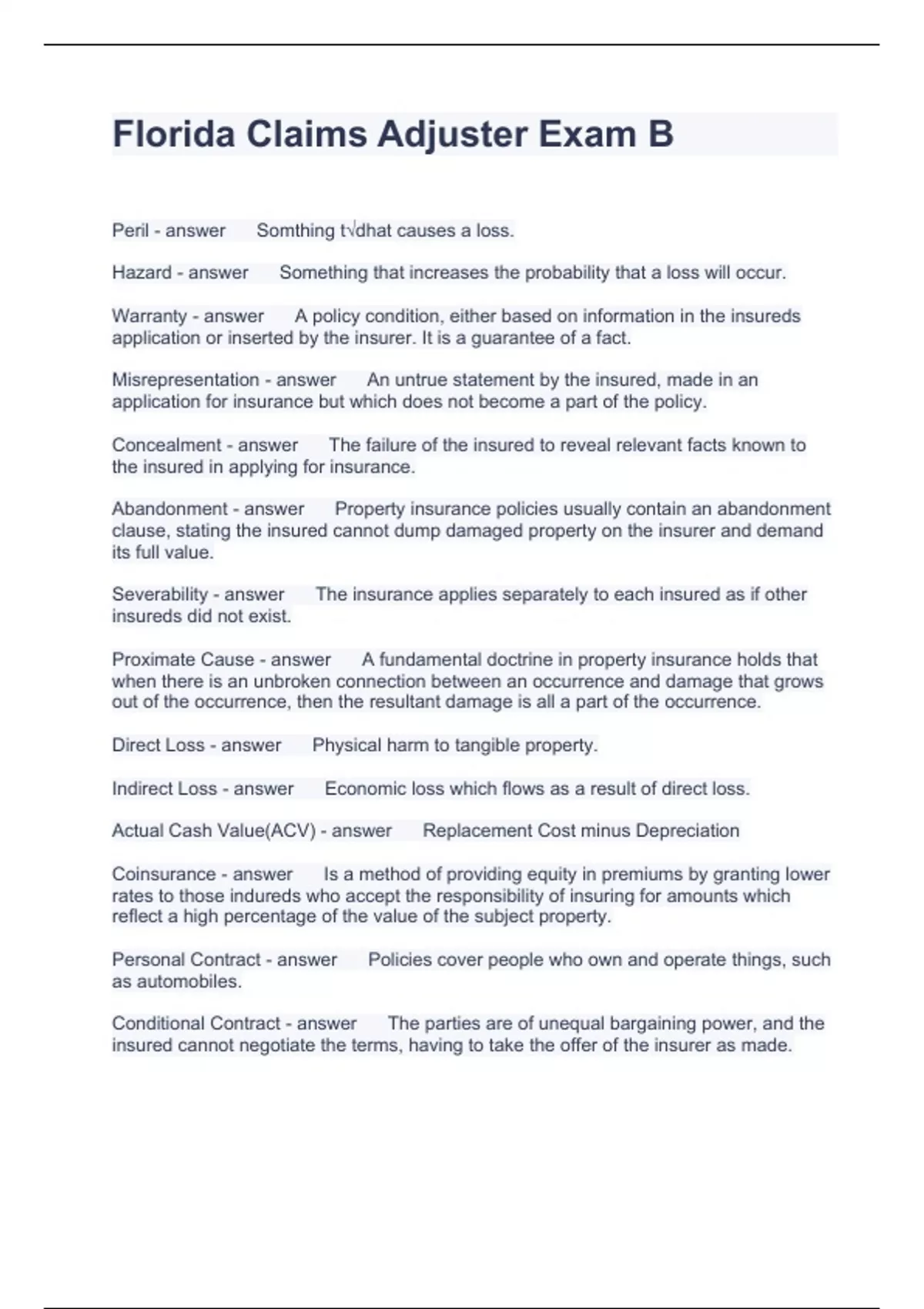 Florida Claims Adjuster Exam B Questions with complete solutions 2023