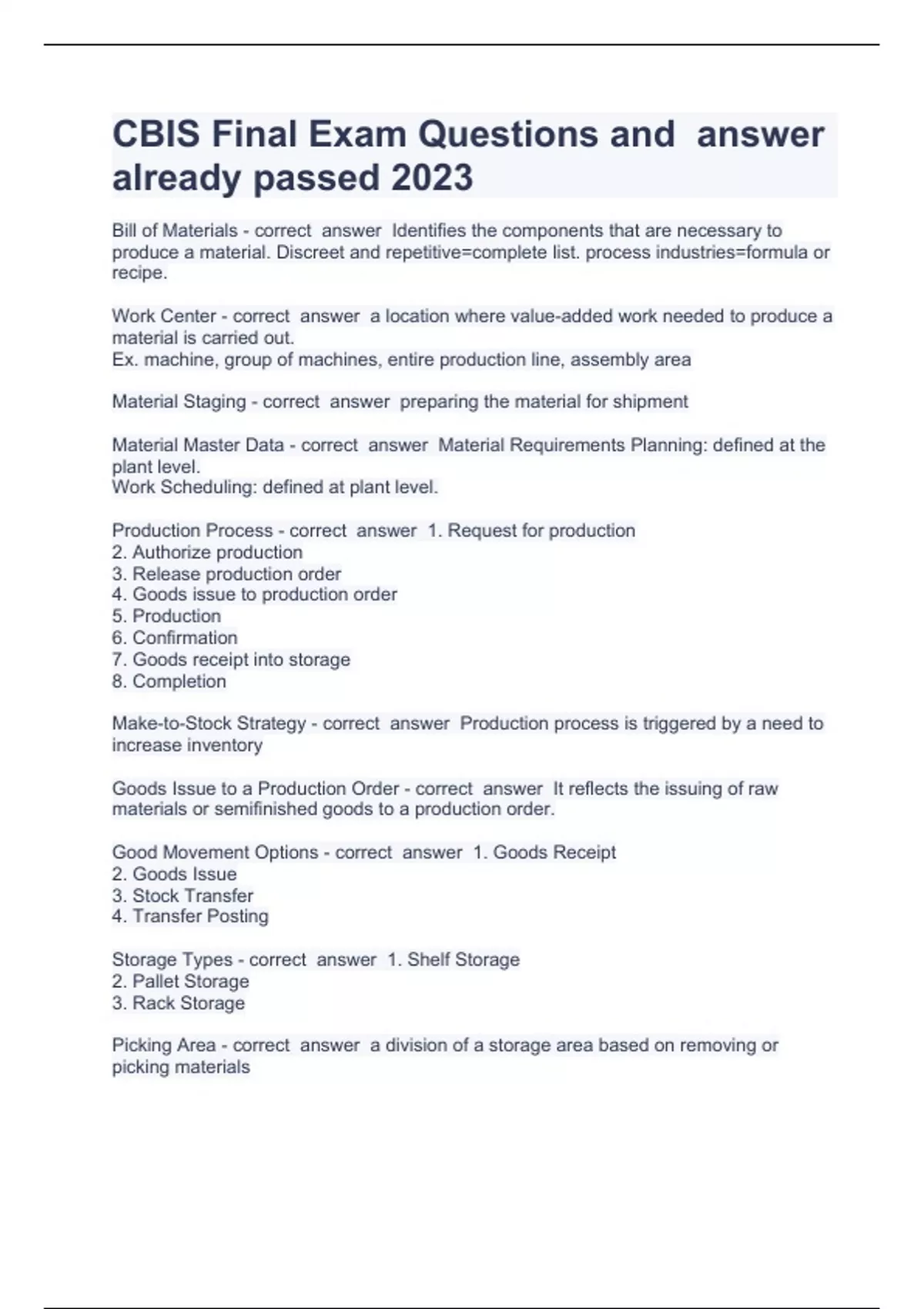 CBIS Final Exam Questions and answer already passed 2023/2024 Bill of Materials - correct answer Identifies the components that are necessary to produce a material. Discreet and repetitive=complete list. process industries=formula or recipe. Work Center - correct answer a location where value-added work needed to produce a material is carried out. Ex. machine, group of machines, entire production line, assembly area Material Staging - correct answer preparing the material for shipment Material Master Data - correct answer Material Requirements Planning: defined at the plant level. Work Scheduling: defined at plant level.
