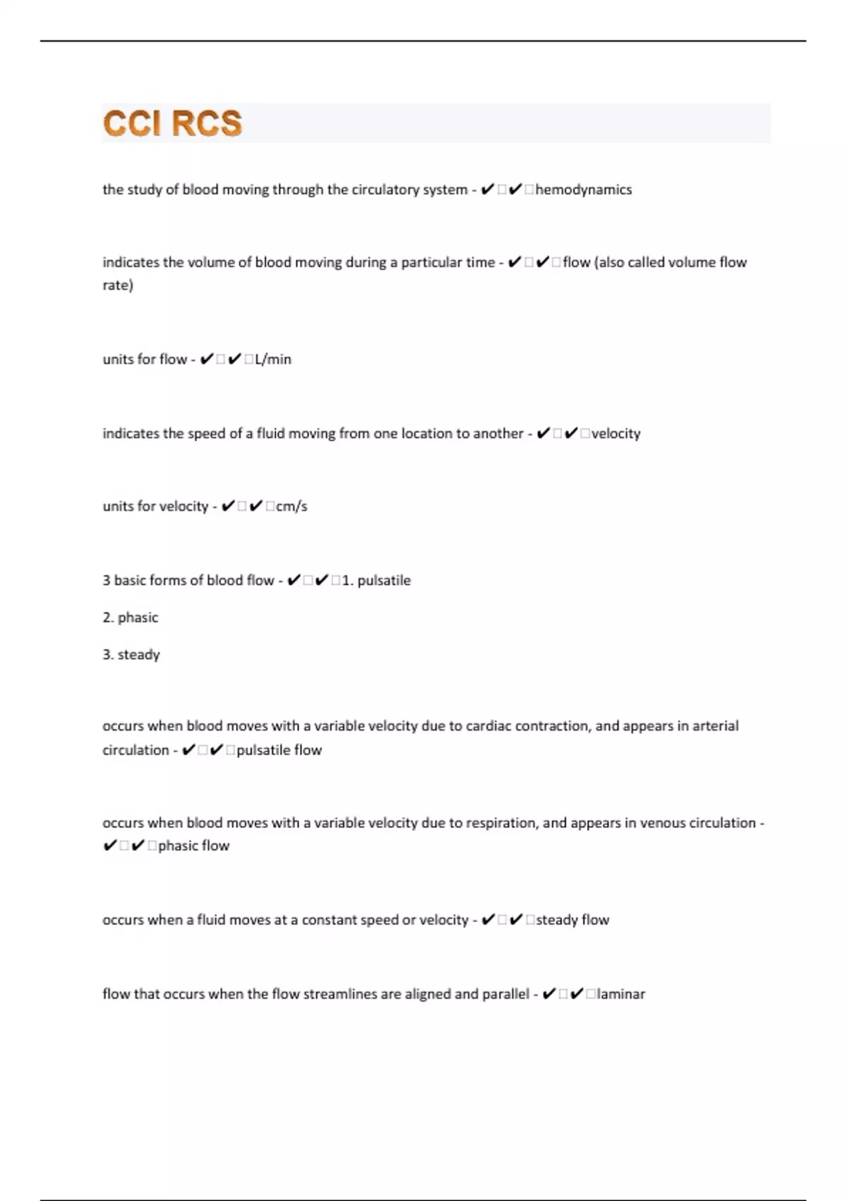 the study of blood moving through the circulatory system - ️️hemodynamics indicates the volume of blood moving during a particular time - ️️flow (also called volume flow rate) units for flow - ️️L/min indicates the speed of a fluid moving from one location to another - ️️velocity units for velocity - ️️cm/s 3 basic forms of blood flow - ️️1. pulsatile 2. phasic 3. steady occurs when blood moves with a variable velocity due to cardiac contraction, and appears in arterial circulation - ️️pulsatile flow occurs when blood moves with a variable velocity due to respiration, and appears in venous circulation - ️️phasic flow occurs when a fluid moves at a constant speed or velocity - ️️steady flow flow that occurs when the flow streamlines are aligned and parallel - ️️laminar