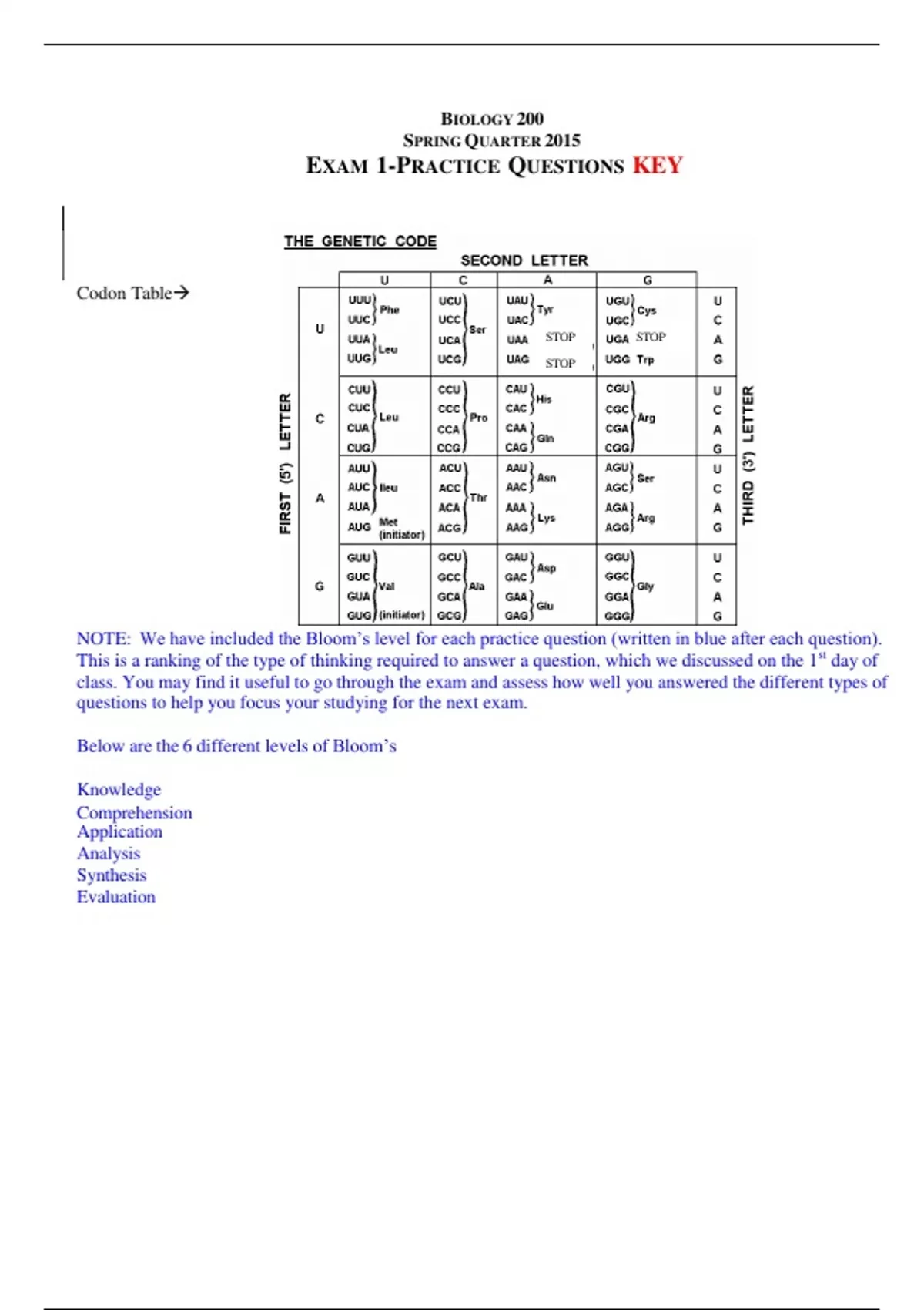 BIOLOGY 200 SPRING QUARTER 2015 EXAM 1-PRACTICE QUESTIONS KEY (test yourself to get an A+)