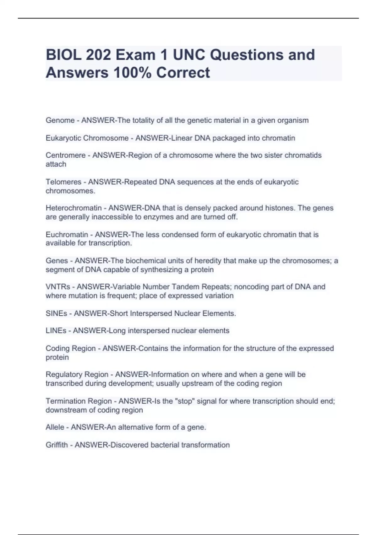 BIOL 202 Exam 1 UNC Questions and Answers 100% CorrectBIOL 202 Exam 1 UNC Questions and Answers 100% CorrectBIOL 202 Exam 1 UNC Questions and Answers 100% CorrectBIOL 202 Exam 1 UNC Questions and Answers 100% Correct Genome - ANSWER-The totality of all the genetic material in a given organism Eukaryotic Chromosome - ANSWER-Linear DNA packaged into chromatin Centromere - ANSWER-Region of a chromosome where the two sister chromatids attach Telomeres - ANSWER-Repeated DNA sequences at the ends of eukaryotic chromosomes.