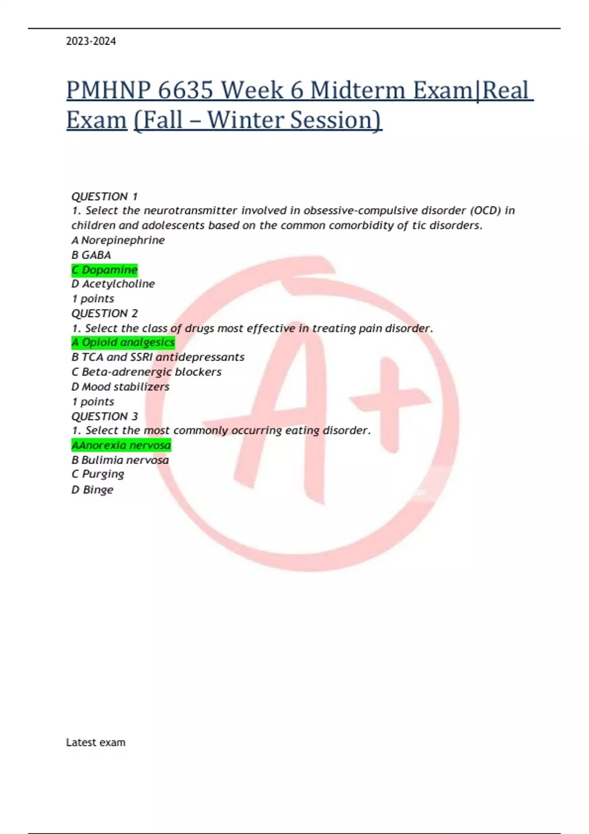 PMHNP 6635 Week 6 Midterm Exam|Real Exam (Fall – Winter Session) QUESTION 1 1. Select the neurotransmitter involved in obsessive-compulsive disorder (OCD) in children and adolescents based on the common comorbidity of tic disorders. A Norepinephrine B GABA C Dopamine D Acetylcholine 1 points QUESTION 2 1. Select the class of drugs most effective in treating pain disorder. A Opioid analgesics B TCA and SSRI antidepressants C Beta-adrenergic blockers D Mood stabilizers 1 points QUESTION 3 1. Select the most commonly occurring eating disorder. AAnorexia nervosa B Bulimia nervosa C Purging D Binge