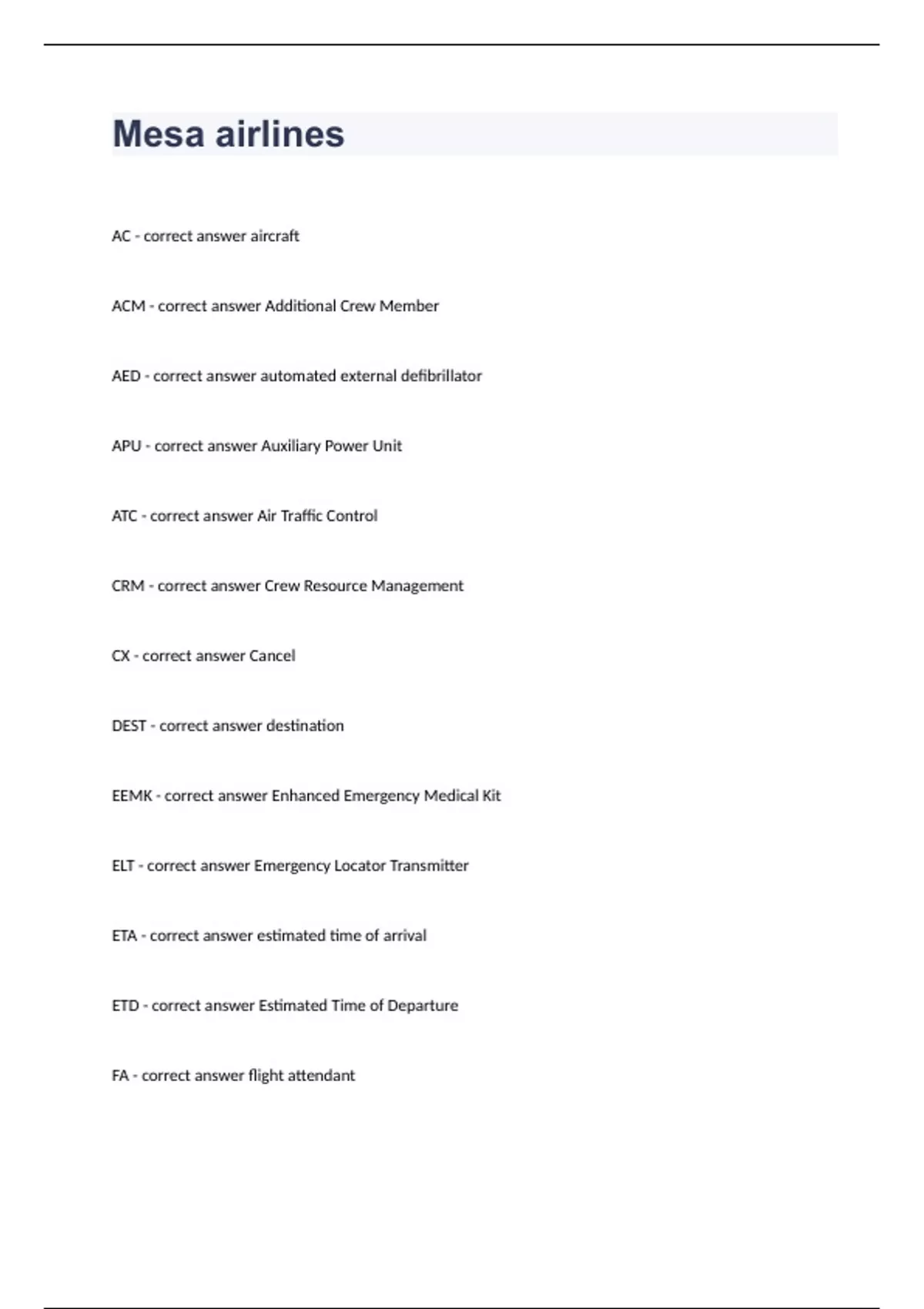 Mesa airlines AC - correct answer aircraft ACM - correct answer Additional Crew Member AED - correct answer automated external defibrillator APU - correct answer Auxiliary Power Unit ATC - correct answer Air Traffic Control CRM - correct answer Crew Resource Management CX - correct answer Cancel DEST - correct answer destination EEMK - correct answer Enhanced Emergency Medical Kit ELT - correct answer Emergency Locator Transmitter ETA - correct answer estimated time of arrival ETD - correct answer Estimated Time of Departure FA - correct answer flight attendant FAA - correct answer Federal Aviation Administration FAK - correct answer first aid kit FAM - correct answer Flight Attendant Manual FAR - correct answer Federal Aviation Regulation FLT - correct answer flight FSDO - correct answer Flight Standards District Office GPU - correct answer Ground Power Unit IFR - correct answer Instrument Flight Rules INOP - correct answer Inoperative IOE - correct answer Initial Operating Experience LAV - correct answer lavatory LEO - correct answer Law enforcment officer MAX - correct answer maximum MEL - correct answer Minimum Equipment List
