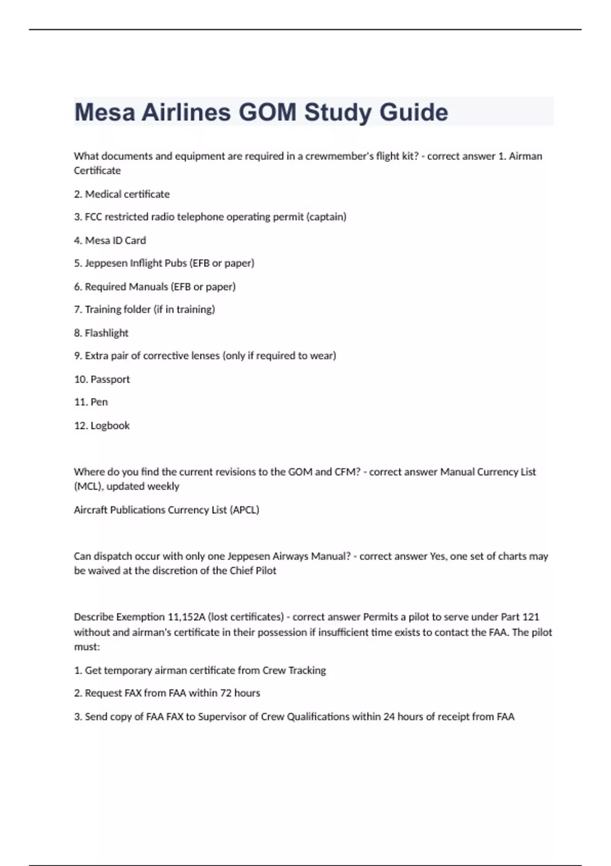 Mesa Airlines GOM Study GuideWhat documents and equipment are required in a crewmember's flight kit? - correct answer 1. Airman Certificate 2. Medical certificate 3. FCC restricted radio telephone operating permit (captain) 4. Mesa ID Card 5. Jeppesen Inflight Pubs (EFB or paper) 6. Required Manuals (EFB or paper) 7. Training folder (if in training) 8. Flashlight 9. Extra pair of corrective lenses (only if required to wear) 10. Passport 11. Pen 12. Logbook Where do you find the current revisions to the GOM and CFM? - correct answer Manual Currency List (MCL), updated weekly Aircraft Publications Currency List (APCL) Can dispatch occur with only one Jeppesen Airways Manual? - correct answer Yes, one set of charts may be waived at the discretion of the Chief Pilot Describe Exemption 11,152A (lost certificates) - correct answer Permits a pilot to serve under Part 121 without and airman's certificate in their possession if insufficient time exists to contact the FAA. The pilot must: 1. Get temporary airman certificate from Crew Tracking 2. Request FAX from FAA within 72 hours 3. Send copy of FAA FAX to Supervisor of Crew Qualifications within 24 hours of receipt from FAA Certification letter is good for 7 days, and can only be used in the 48 contiguous states and DC What is your show time? What if another crew memeber is not there within 10 minutes? - correct answer 45 minutes prior to the first scheduled departure time. If one crew member has not shown within 10 minutes, other crew member will contact System Operations Control. How does a Pilot maintain currency for FAR 121 operations (ground training, proficiency check, line check, landings)? - correct answer 1. Training requirements outlined in the certificate holders FRMP must be incorporated into its operator specific ground training curriculum. Every 12 calendar months 2. 3 TO/Lnd in A/C type or Sim within preceding 90 days 3. Line check PIC within preceding 12 calendar months and in addition within the preceding 6 months proficiency check or sim training Define "low time SIC". - correct answer a SIC that has less than 100 hours in 121 and on type What limitations exist for a "low time SIC"? - correct answer Restricted from taking off or landing if: 1. Special airports 2. Vis less than 3/4 mile/RVR 4000. <1 SM takeoffs made by PIC. <5,000 RVR takeoffs made by PIC 3. Contaminated runway (water, snow, slush) 4. Braking action less than "good" 5. >15 Knts crosswind 6. Windshear 7. PIC Discretion Define a "high minimums" Captain - correct answer Captain that has less than 100 hours as PIC (IOE time is included) What limiations exist for a "high minimums" Captain? - correct answer Add 100' and 1/2 SM to the MDA/DA for landing minimums. Apply same to takeoff minimums for takeoff alternate requirements. Alternate airports requires 300'/1SM minimum. How is crewmember SARA qualification determined? - correct answer 1) The PIC or SIC has made an entry to that airport (including a takeoff and landing) while serving as a pilot flight crewmember; or (2) The PIC has thoroughly reviewed all aspects of the Jeppesen Special Airport Qualifica- tion charts published for that airport. Describe the ways to be qualified for a particular SARA airport. - correct answer 1) The PIC or SIC has made an entry to that airport (including a takeoff and landing) while serving as a pilot flight crewmember; or (2) The PIC has thoroughly reviewed all aspects of the Jeppesen Special Airport Qualifica- tion charts published for that airport. Define consolidation of knowledge and skills. - correct answer New pilot must log 100 hours in 120 days following initial checkride, Sim hours do not count. Can be extended to 150 days. Can be extended to 180 days. What are the pairing requirements (green on green). - correct answer PIC or SIC MUST have 75 hours of line operating flight time on type. What are your minimum Initial Operating Experience (IOE) requirements? - correct answer 25 Hours Does FAR Part 91 flying apply to the flight duty period and rest requirements? - correct answer Yes Are all Mesa Airlines flight operations "unaugmented"? - correct answer Yes. No long haul flying requiring extra crew members. Can deadhead transportation be considered part of a rest period? - correct answer No When does a flight duty period (FDP) begin and end? - correct answer Starts when reporting for duty with the intent to fly (45 minutes prior to pushback) and ends when the aircraft is parked with no further intent to fly. Define "suitable accommodation". - correct answer Quiet, dark, and horizontal