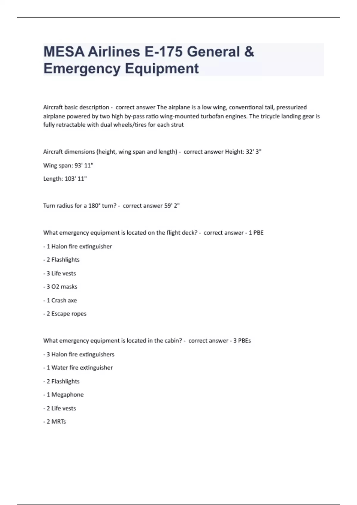 MESA Airlines E-175 General & Emergency Equipment.Aircraft basic description - correct answer The airplane is a low wing, conventional tail, pressurized airplane powered by two high by-pass ratio wing-mounted turbofan engines. The tricycle landing gear is fully retractable with dual wheels/tires for each strut Aircraft dimensions (height, wing span and length) - correct answer Height: 32' 3" Wing span: 93' 11" Length: 103' 11" Turn radius for a 180° turn? - correct answer 59' 2" What emergency equipment is located on the flight deck? - correct answer - 1 PBE - 1 Halon fire extinguisher - 2 Flashlights - 3 Life vests - 3 O2 masks - 1 Crash axe - 2 Escape ropes What emergency equipment is located in the cabin? - correct answer - 3 PBEs - 3 Halon fire extinguishers - 1 Water fire extinguisher - 2 Flashlights - 1 Megaphone - 2 Life vests - 2 MRTs - 2 Portable O2 bottles - 2 First aid kits - 1 EEMK - 1 AED Which forms and manuals must be checked during the originating/receiving checklist? - correct answer - Maintenance log can - QRH - Airworthiness certificate - Registration certificate - 2 checklists - TOLD cards Will the cockpit dome light illuminate on an unpowered airplane? - correct answer Only if the flight attendant panel 'COURTESY LIGHTS' switch is in 'AUTO' How are the emergency lights powered? - correct answer 4 ELPUs (Emergency Light Power Units) charged off the DC BUS 1 How long will the emergency lights last once illuminated? - correct answer 10 min When will the emergency lights automatically illuminate? - correct answer Provided the switch is in 'AUTO' if the DC BUSSES lose power or the airplane's electrical power is turned off, the emergency lights will automatically illuminate Where does the flight attendant check the potable water quantity and waste service tank system? - correct answer Aft flight attendant panel What does a Waste Service Tank light mean on the aft flight attendant panel? Tank Full light? - correct answer Tank is 75% full. Tank is full