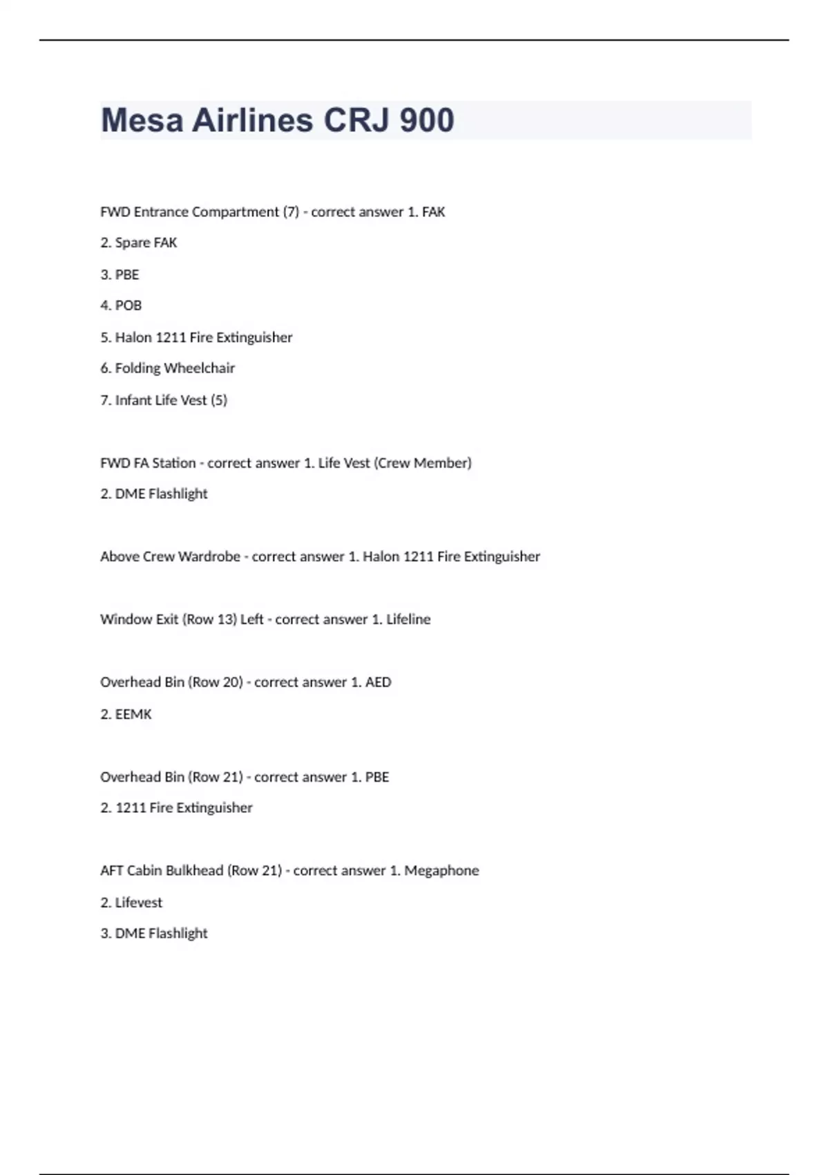 Mesa Airlines CRJ 900FWD Entrance Compartment (7) - correct answer 1. FAK 2. Spare FAK 3. PBE 4. POB 5. Halon 1211 Fire Extinguisher 6. Folding Wheelchair 7. Infant Life Vest (5) FWD FA Station - correct answer 1. Life Vest (Crew Member) 2. DME Flashlight Above Crew Wardrobe - correct answer 1. Halon 1211 Fire Extinguisher Window Exit (Row 13) Left - correct answer 1. Lifeline Overhead Bin (Row 20) - correct answer 1. AED 2. EEMK Overhead Bin (Row 21) - correct answer 1. PBE 2. 1211 Fire Extinguisher AFT Cabin Bulkhead (Row 21) - correct answer 1. Megaphone 2. Lifevest 3. DME Flashlight Flight Deck - correct answer 1. DME Flashlight (2) 2. Smoke Googles (3) 3. Halon 1211 Fire Extinguisher 4. Crash Axe (1) 5. Crew Member Oxygen Mark (3) 6. Escape Rope (1) 7. Life Vest (3) 8. PBE Coat Closet - correct answer 1. PBE 2. FAK FWD Lavatory - correct answer 1. Halon 1301 Fire Extinguisher 2. Smoke Detector Window Exit (Row 13) Right - correct answer 1. Lifeline AFT Bulkhead - correct answer 1. POB AFT Lavatory - correct answer 1. Halon 1301 Fire Extinguisher 2. Smoke Detector How Many Equipment Cabin? - correct answer 2 DME Flashlights 3 Crew Member Lifevest 3 Crew Member Smoke Googles 3 Crew Member Oxygen Mask -Escape Rope -Crash Axe -Halon 1211 Fire Extinguisher