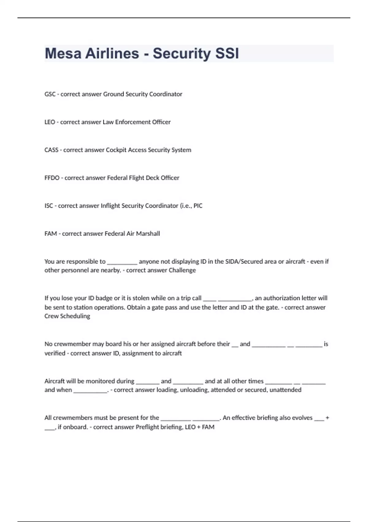 Mesa Airlines - Security SSIGSC - correct answer Ground Security Coordinator LEO - correct answer Law Enforcement Officer CASS - correct answer Cockpit Access Security System FFDO - correct answer Federal Flight Deck Officer ISC - correct answer Inflight Security Coordinator (i.e., PIC FAM - correct answer Federal Air Marshall You are responsible to _________ anyone not displaying ID in the SIDA/Secured area or aircraft - even if other personnel are nearby. - correct answer Challenge If you lose your ID badge or it is stolen while on a trip call ____ __________, an authorization letter will be sent to station operations. Obtain a gate pass and use the letter and ID at the gate. - correct answer Crew Scheduling No crewmember may board his or her assigned aircraft before their __ and __________ __ ________ is verified - correct answer ID, assignment to aircraft Aircraft will be monitored during _______ and _________ and at all other times ________ __ _______ and when __________. - correct answer loading, unloading, attended or secured, unattended All crewmembers must be present for the _________ ________. An effective briefing also evolves ___ + ___, if onboard. - correct answer Preflight briefing, LEO + FAM The Pilot in Command (PIC) has final authority regarding the operation of the aircraft and may _______ any person from the flight deck in the interest of safety. - correct answer Exclude Flight attendants are only authorized to occupy the flight deck jump seat when they are ________ to the flight as a member of the working crew. Flight attendants are ___ permitted to occupy either the Captain or First Officer's seat. - correct answer assigned, not Any time the flight deck door is opened in-flight, a _________ and ________ closing and locking verification procedure must be used to verify that the door is closed and locked. - correct answer Challenge, Response Prior to closing aircraft doors, all crewmembers and each armed individual must know the _______ & ____ __________ of all armed individuals on the flight. (i.e., LEO, FAM, FFDO). - correct answer Identity & seat assignment While onboard an aircraft in flight, FAMS generally will take __ action unless the offense involves acts of ________, ________, interference with flight crew that rises to level of violence, threats to the flight deck, integrity of the aircraft, or the safety of passengers and crew. - correct answer No, terrorism, violence Prior to the FAM team boarding the aircraft, ground personnel will __________ _______ the crew that a FAM team is on board. - correct answer Discreetly inform TSA requires each aircraft receive an aircraft receive an aircraft search prior __ ___ _____ ______ __ ___ ________ ___. - correct answer to the first flight of the calendar day Flights to or from Canada require a ______ search, except for the first flight of the calendar day. - correct answer visual The areas that are most likely to hide a weapon or IED include ________ ____, _____ ____, _______, ______, ___ ____________, _____ ____, ___ ________, ______ _____. - correct answer Overhead bins, atlas bins, storage, closet, lav compartments, wheel well, PAX seatbacks, galley trash. Tamper-evident seals are located on the CRJ 200 & E-175 ______ ______ and the E-175 __________ ___ under the aft galley. - correct answer Toilet shroud, electronic bay Special fastener locations are on the CRJ 700/900 ______ shroud. - correct answer Toilet Aircraft searches on American Eagle are performed by ______ ________. - correct answer Ground personal Full cabin and flight deck aircraft searches on United Express are performed by ______ ________. Flight attendants are not responsible for ______ ______ when in ______. - correct answer Ground personal, visual research, Canada Mesa is required to notify the ___ in accordance with if, while conducting aircraft search measure, any of the following are discovered. This will normally be ensued by contacting the ___. - correct answer TSA, GSC (Ground Security Coordinator). Regardless of whether a search is required by TSA, it is a good practice for crews to conduct an ________ search of their own, time permitting. - correct answer Informal Common Strategy categorizes _ level of threat. - correct answer 4 While the greatest threat comes from those who seek to harm others, ______ also pose a risk to the safety and security of those on board. - correct answer actors The first and last 45 minutes is when a ______ attempt is most likely to occur. - correct answer hijack Suspicious activity or behavior is any activity, condition or behavior that is "___ __ ___ ________" or ___ __ _______ for the situation. - correct answer "out of the ordinary" or out of context Suspicious behavioral indicators that may be ___________ __ _ __ ____ _________for the time and location when comparing ___ _________ to all others. - correct answer exemplified by 1 or more behaviors, one passenger