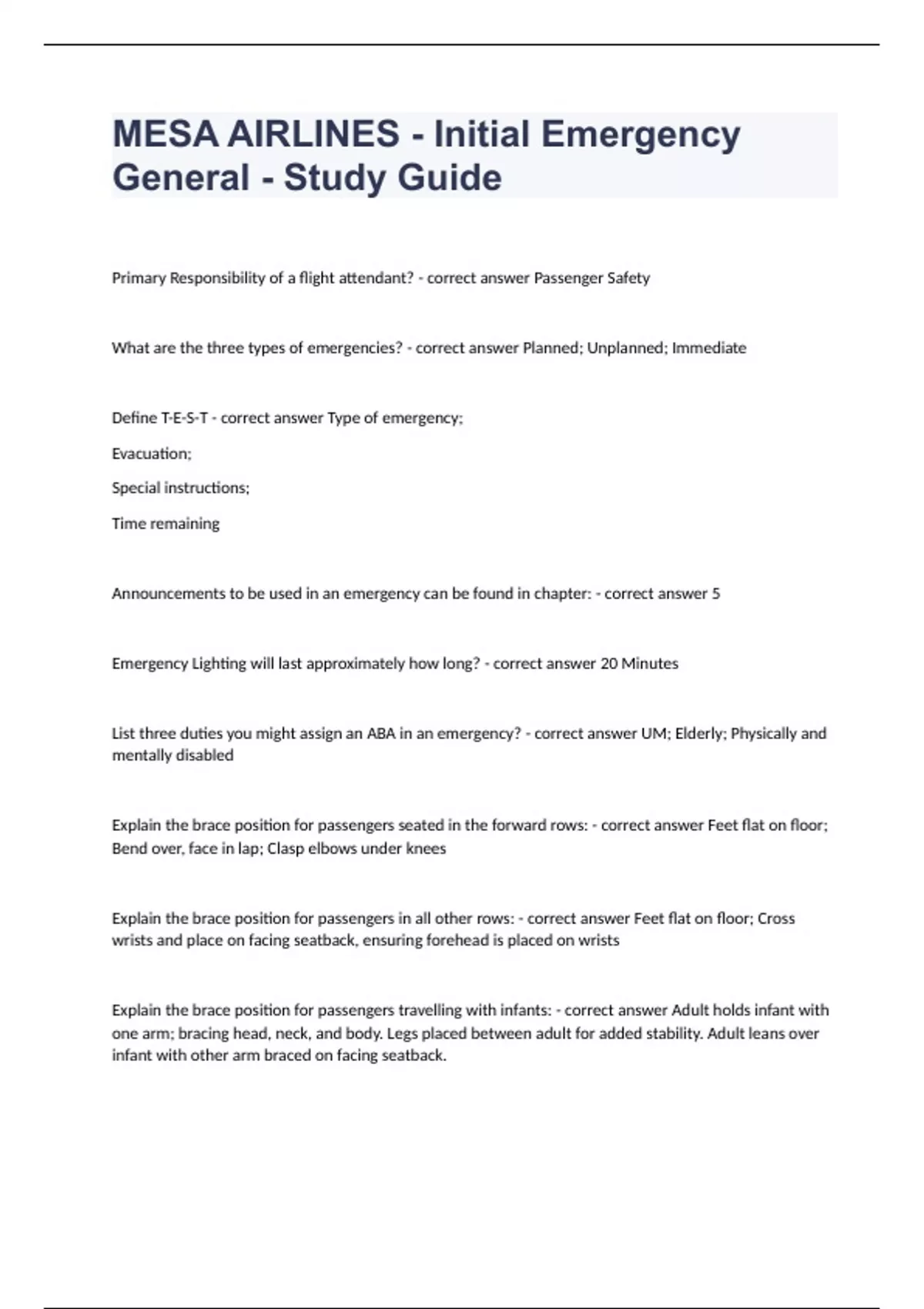 MESA AIRLINES - Initial Emergency General - Study Guide Primary Responsibility of a flight attendant? - correct answer Passenger Safety What are the three types of emergencies? - correct answer Planned; Unplanned; Immediate Define T-E-S-T - correct answer Type of emergency; Evacuation; Special instructions; Time remaining Announcements to be used in an emergency can be found in chapter: - correct answer 5 Emergency Lighting will last approximately how long? - correct answer 20 Minutes List three duties you might assign an ABA in an emergency? - correct answer UM; Elderly; Physically and mentally disabled Explain the brace position for passengers seated in the forward rows: - correct answer Feet flat on floor; Bend over, face in lap; Clasp elbows under knees Explain the brace position for passengers in all other rows: - correct answer Feet flat on floor; Cross wrists and place on facing seatback, ensuring forehead is placed on wrists Explain the brace position for passengers travelling with infants: - correct answer Adult holds infant with one arm; bracing head, neck, and body. Legs placed between adult for added stability. Adult leans over infant with other arm braced on facing seatback. Explain the flight attendant brace position (Forward and Aft) - correct answer Forward; Feet flat on floor, Hands under thighs, palms up; AFT; Feet flat on floor, Hands under thighs, palms up; chin down During takeoff and landing, what should the flight attendant do while sitting in the jumpseat? - correct answer Be in brace position; Conducting 60 second review Four indications of depressurization: - correct answer Ears Pop; Air pulled from nose and mouth; Cabin temperature changes dramatically; Fog forms in cabin; Also; Escaping air creates Considerable noise; Possible dental pain; Possible dizziness and Hypoxia What are the correct steps IN ORDER that must be taken in the event of a rapid decompression? - correct answer 1.) Don oxygen mask; 2.) Secure yourself, not standing; anticipate emergency descent and assess altitude; 3.) Remain seated until flight deck makes a PA announcement; 4.) Turn on main cabin lights; 5.) Check Lavatory;