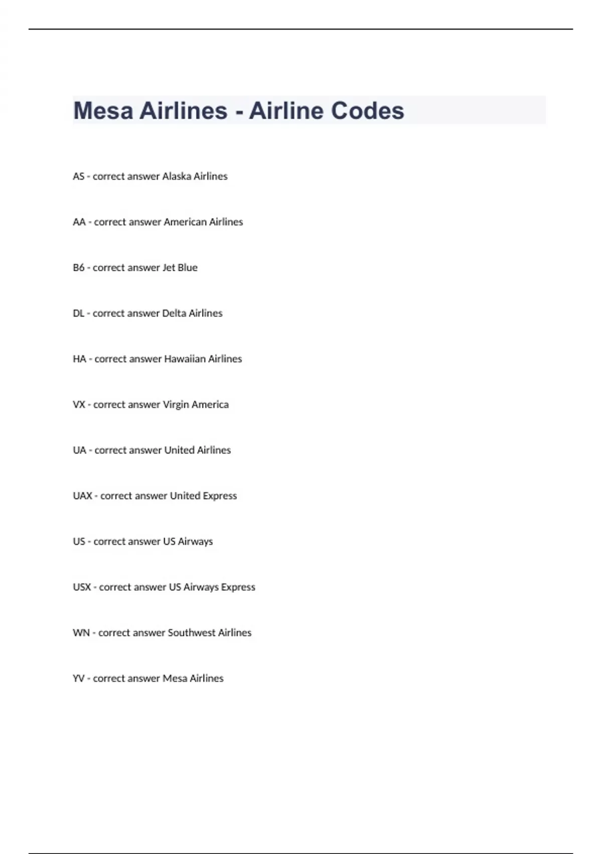 Mesa Airlines - Airline Codes question n answers graded A+