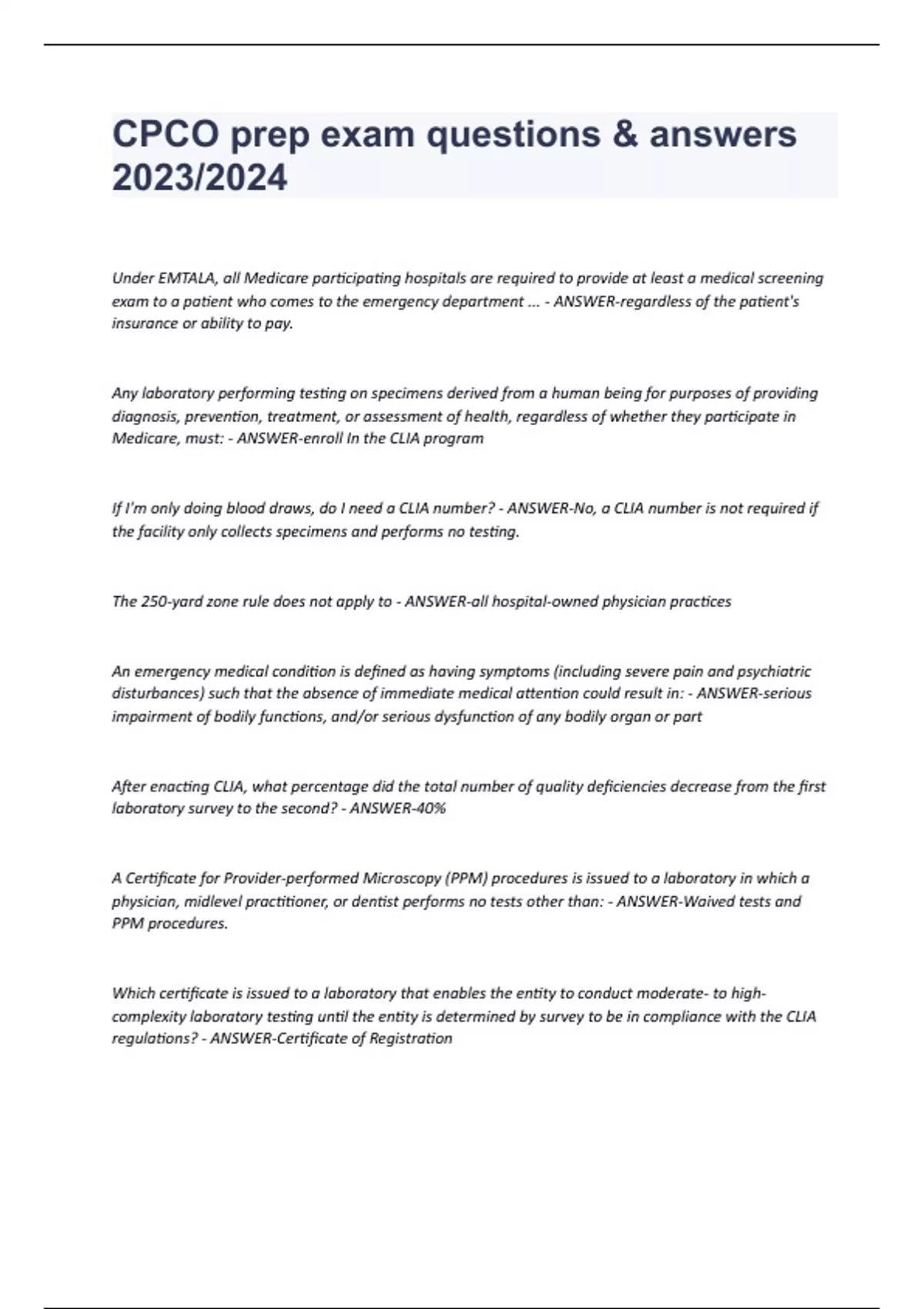 CPCO prep exam questions & answers 2023/2024 Under EMTALA, all Medicare participating hospitals are required to provide at least a medical screening exam to a patient who comes to the emergency department ... - ANSWER-regardless of the patient's insurance or ability to pay. Any laboratory performing testing on specimens derived from a human being for purposes of providing diagnosis, prevention, treatment, or assessment of health, regardless of whether they participate in Medicare, must: - ANSWER-enroll In the CLIA program If I'm only doing blood draws, do I need a CLIA number? - ANSWER-No, a CLIA number is not required if the facility only collects specimens and performs no testing. The 250-yard zone rule does not apply to - ANSWER-all hospital-owned physician practices An emergency medical condition is defined as having symptoms (including severe pain and psychiatric disturbances) such that the absence of immediate medical attention could result in: - ANSWER-serious impairment of bodily functions, and/or serious dysfunction of any bodily organ or part After enacting CLIA, what percentage did the total number of quality deficiencies decrease from the first laboratory survey to the second? - ANSWER-40% A Certificate for Provider-performed Microscopy (PPM) procedures is issued to a laboratory in which a physician, midlevel practitioner, or dentist performs no tests other than: - ANSWER-Waived tests and PPM procedures. Which certificate is issued to a laboratory that enables the entity to conduct moderate- to high-complexity laboratory testing until the entity is determined by survey to be in compliance with the CLIA regulations? - ANSWER-Certificate of Registration