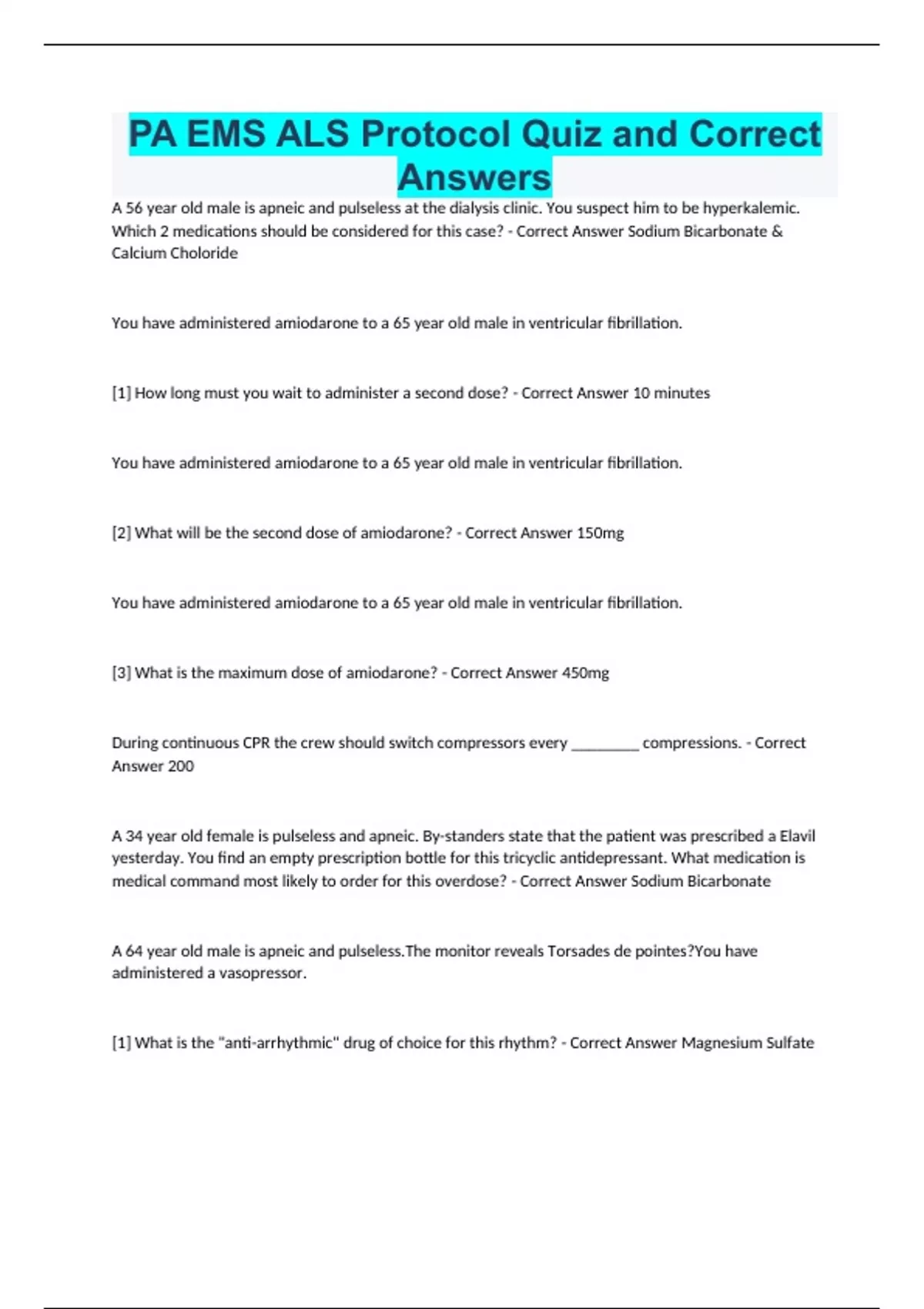PA EMS ALS Protocol Quiz and Correct Answers A 56 year old male is apneic and pulseless at the dialysis clinic. You suspect him to be hyperkalemic. Which 2 medications should be considered for this case? - Correct Answer Sodium Bicarbonate & Calcium Choloride You have administered amiodarone to a 65 year old male in ventricular fibrillation. [1] How long must you wait to administer a second dose? - Correct Answer 10 minutes You have administered amiodarone to a 65 year old male in ventricular fibrillation. [2] What will be the second dose of amiodarone? - Correct Answer 150mg You have administered amiodarone to a 65 year old male in ventricular fibrillation. [3] What is the maximum dose of amiodarone? - Correct Answer 450mg During continuous CPR the crew should switch compressors every ________ compressions. - Correct Answer 200 A 34 year old female is pulseless and apneic. By-standers state that the patient was prescribed a Elavil yesterday. You find an empty prescription bottle for this tricyclic antidepressant. What medication is medical command most likely to order for this overdose? - Correct Answer Sodium Bicarbonate A 64 year old male is apneic and pulseless.The monitor reveals Torsades de pointes?You have administered a vasopressor. [1] What is the "anti-arrhythmic" drug of choice for this rhythm? - Correct Answer Magnesium Sulfate