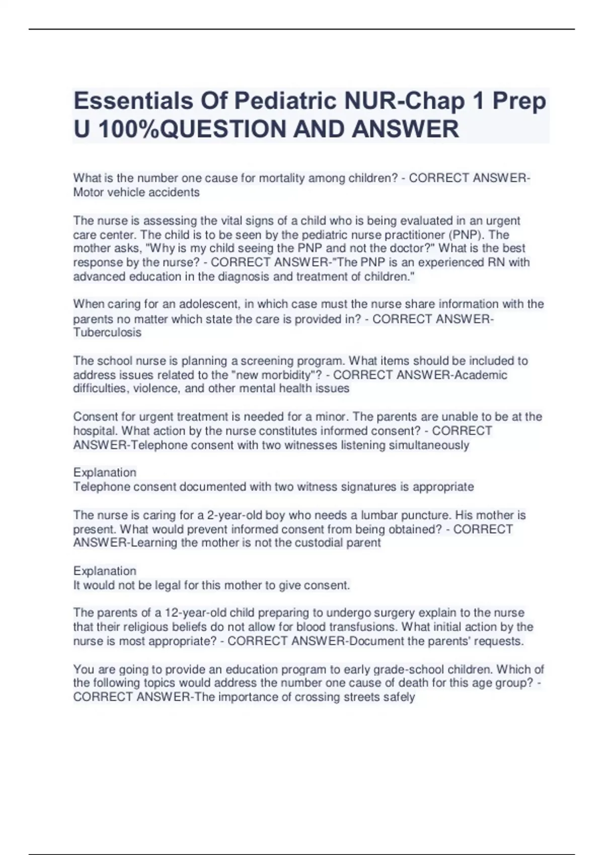 Essentials Of Pediatric NUR-Chap 1 Prep U 100%QUESTION AND ANSWER What is the number one cause for mortality among children? - CORRECT ANSWERMotor vehicle accidents The nurse is assessing the vital signs of a child who is being evaluated in an urgent care center. The child is to be seen by the pediatric nurse practitioner (PNP). The mother asks, "Why is my child seeing the PNP and not the doctor?" What is the best response by the nurse? - CORRECT ANSWER-"The PNP is an experienced RN with advanced education in the diagnosis and treatment of children." When caring for an adolescent, in which case must the nurse share information with the parents no matter which state the care is provided in? - CORRECT ANSWERTuberculosis The school nurse is planning a screening program. What items should be included to address issues related to the "new morbidity"? - CORRECT ANSWER-Academic difficulties, violence, and other mental health issues Consent for urgent treatment is needed for a minor. The parents are unable to be at the hospital. What action by the nurse constitutes informed consent? - CORRECT ANSWER-Telephone consent with two witnesses listening simultaneously Explanation Telephone consent documented with two witness signatures is appropriate The nurse is caring for a 2-year-old boy who needs a lumbar puncture. His mother is present. What would prevent informed consent from being obtained? - CORRECT ANSWER-Learning the mother is not the custodial parent Explanation It would not be legal for this mother to give consent. The parents of a 12-year-old child preparing to undergo surgery explain to the nurse that their religious beliefs do not allow for blood transfusions. What initial action by the nurse is most appropriate? - CORRECT ANSWER-Document the parents' requests. You are going to provide an education program to early grade-school children. Which of the following topics would address the number one cause of death for this age group? - CORRECT ANSWER-The importance of crossing streets safely Explanation Motor-vehicle accidents are a leading cause of death in this age group. The nurse is talking with the mother of a 2-year-old girl during a scheduled visit. Which of the following teaching subjects least supports the emphasis on preventive care? - CORRECT ANSWER-Explaining how to teach self hand washing Explanation: Teaching hand washing helps to prevent infection, emphasizes preventive care, and is basic to avoiding many common illnesses. The nurse is caring for a 14-year-old boy with a debilitating illness who wants to attend school. Which of the following interventions addresses the child's physical health but not his quality of life? - CORRECT ANSWER-Assessing the child's daily oxygen supplement needs After teaching a group of nursing students about major threats to children's health, the instructor determines that the teaching was successful when the students state which of the following? - CORRECT ANSWER-The prevalence of chronic disease is increasing. Morbidity rates among children are most highly associated with which cause? - CORRECT ANSWER-Environmental factors Explanation The factors most commonly associated with child morbidity are environmental and socioeconomic problems. The more difficult the societal issues and the more marked the environmental poverty, the higher the illness rates and childhood morbidity A 16-year-old child is admitted to the hospital for treatment after a motor vehicle crash. Review of the child's record reveals that she has the legal right to consent to and make decisions for treatment. What is the term for this client's status? - CORRECT ANSWEREmancipated minor More nurses are stepping into the role of the advanced practice nurse. Which of the following would be the nurse to provide care for children under the age of 18? - CORRECT ANSWER-Pediatric nurse practitioner In 2007 the World Factbook published statistics that showed the United States still lagged behind other industrialized nations in the incidence of infant mortality. What is one reason that the United States has a higher infant mortality rate than other countries? - CORRECT ANSWER-Low birth weight Explanation Many factors may be associated with high infant mortality rates and poor health. Low birth weight and late or nonexistent prenatal care are the main factors in the poor rankings in infant mortality. A nurse is looking for information about advocacy activities related to promoting literacy. Which of the following would be most appropriate for the nurse to contact? - CORRECT ANSWER-Society of Pediatric Nurses (SPN) Explanation The Society of Pediatric Nurses (SPN) has several position statements regarding advocacy issues such as promoting literacy, preventing violence against children, and pediatric injury prevention. A nurse is considering employment in a practice that promotes family-centered care. When considering this position, the nurse recognizes that this philosophy will: - CORRECT ANSWER-promote the involvement of the child and parents as members of the health care team. When describing the State Children's Health Insurance Program (SCHIP) to a group of families, which of the following would the nurse include? - CORRECT ANSWER-It provides health insurance to children whose families are not eligible for Medicaid but cannot afford to purchase health insurance Explanation The State Children's Health Insurance Program (SCHIP) is designed to expand health insurance to children whose families make too much money to qualify for Medicaid, but who cannot afford to purchase health insurance To decrease childhood mortality, pediatric nurses need to consistently engage in what activity throughout all age groups? - CORRECT ANSWER-Teach injury prevention and proper safety practices. Explanation: The leading cause of death throughout childhood is unintentional injury. Pediatric nurses are developing more home care and community-based services for children with chronic illnesses because: - CORRECT ANSW