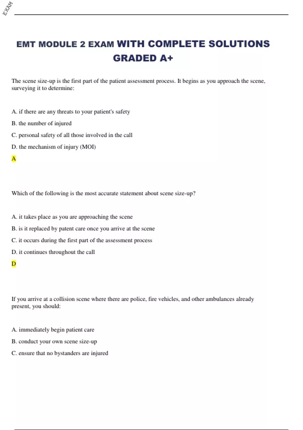 EMT (EMERGENCY MEDICAL TECHNICIAN) MODULE 2 EXAM WITH COMPLETE SOLUTIONS GRADED A The scene size-up is the first part of the patient assessment process. It begins as you approach the scene, surveying it to determine: A. if there are any threats to your patient's safety B. the number of injured C. personal safety of all those involved in the call D. the mechanism of injury (MOI) A Which of the following is the most accurate statement about scene size-up? A. it takes place as you are approaching the scene B. is it replaced by patent care once you arrive at the scene C. it occurs during the first part of the assessment process D. it continues throughout the call