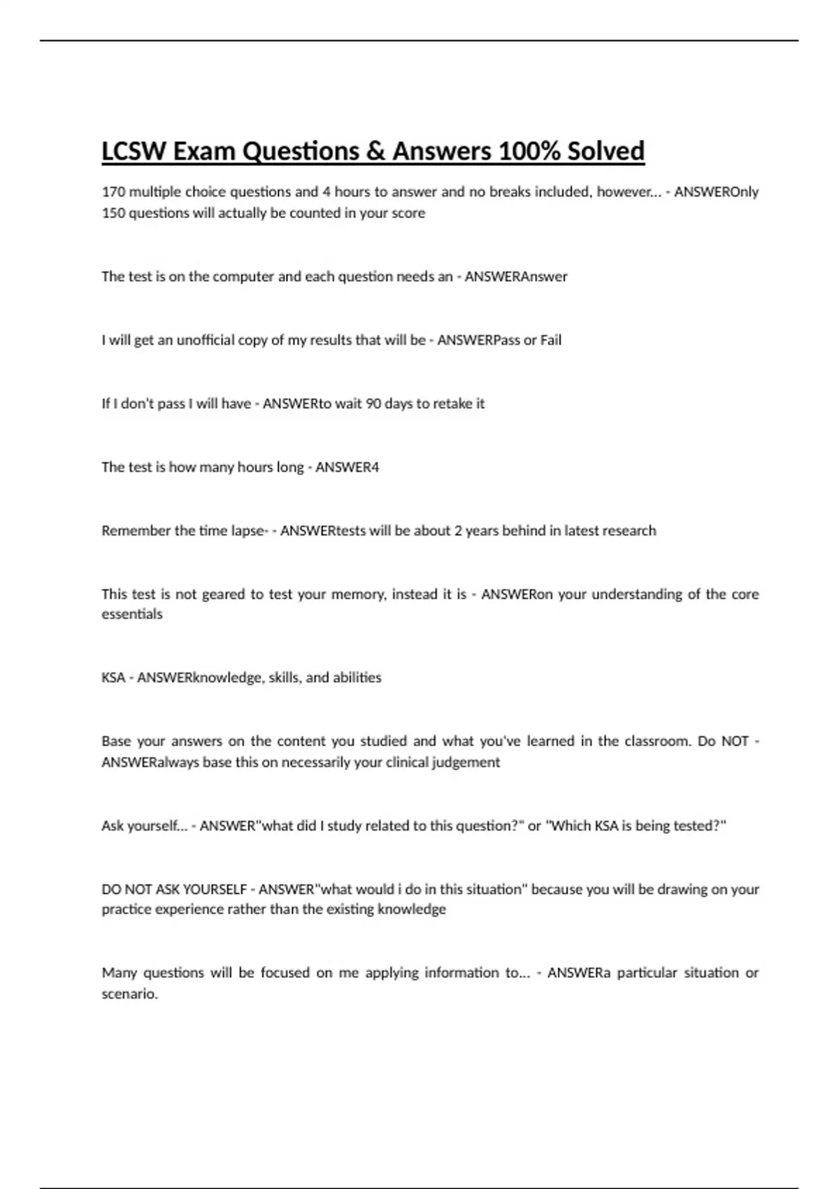170 multiple choice questions and 4 hours to answer and no breaks included, however... - ANSWEROnly 150 questions will actually be counted in your score The test is on the computer and each question needs an - ANSWERAnswer I will get an unofficial copy of my results that will be - ANSWERPass or Fail If I don't pass I will have - ANSWERto wait 90 days to retake it The test is how many hours long - ANSWER4 Remember the time lapse- - ANSWERtests will be about 2 years behind in latest research This test is not geared to test your memory, instead it is - ANSWERon your understanding of the core essentials KSA - ANSWERknowledge, skills, and abilities Base your answers on the content you studied and what you've learned in the classroom. Do NOT - ANSWERalways base this on necessarily your clinical judgement Ask yourself... - ANSWER"what did I study related to this question?" or "Which KSA is being tested?" DO NOT ASK YOURSELF - ANSWER"what would i do in this situation" because you will be drawing on your practice experience rather than the existing knowledge Many questions will be focused on me applying information to... - ANSWERa particular situation or scenario. Do NOT get lost in the scenario, in practice social workers often alter their actions based on many contextual variables, HOWEVER in this exam - ANSWERthere is only one right answer and it is based on the KSAs. Focus on the content being tested NOT - ANSWERthe details of the vignette Do not think about the laws in your state because these questions are the same for every state and those laws vary, Instead - ANSWERfocus on the content being tested The best answers are not always - ANSWERthe correct ones Look for qualifying words like... - ANSWER"least, most, first, not, best, next" Put the qualifying word in front of each answer to ensure - ANSWERthat you are focusing on what is important. A theory is a set of - ANSWERinterrelated concepts that are organized in a way that explain aspects of everyday life. A practice model is a way - ANSWERin which a theory is operationalized. A perspective is a point of view - ANSWERthat is usually broader and at a higher level of abstraction Paradigm - ANSWERTheory, model or perspective Answer the question related to - ANSWERthe paradigm the question states. For example, "what theory is used in..." or "what practice", or "what model" STAY WITH THE MATERIAL IN THE QUESTION AND DO NOT ADD - ANSWERINFORMATION BASED ON YOUR PAST EXPERIENCES Look for quotations in the question as - ANSWERclues for the answer The lens that you should use is often listed in the - ANSWERlast sentence of the question The VERB choices in answers are often clues - ANSWER"provide, explore, engage, ignore or wait" Verbs like provide mean - ANSWERwhat a therapist will do or should do Verbs like explore or engage mean - ANSWERthat the SW is relying on the client Verbs like ignore or wait - ANSWERmeans that a SW is not taking critical information into account Use Maslow's Hierarchy of needs to answer questions about - ANSWERwhat to do First or Next- ex: a SW should always assess health and safety needs first before relationship needs Consider the problem-solving process when finding the answer. And focus on the correct order. The problem-solving process includes: - ANSWERENGAGEMENT, ASSESSMENT, PLANNING, INTERVENTION, EVALUATION, AND TERMINATION First session= ENGAGEMENT= - ANSWERwhy is the client there, why they are seeking services now, the role of the SW, what to expect in treatment, listen to client, explain limits of confidentiality Reference to a specific session in a question is also a clue to determine what - ANSWERstage of problem-solving they are in The answer to what the SW would do IS dependent ON - ANSWERthe PROBLEM-SOLVING STAGE they are in Stages can be identified with clues like - ANSWER"when developing rapport" to indicate engagement, "when gathering information on the problem" to indicate Assessment or "when developing the contract" to indicate Planning, "when implementing skills" to indicate Intervention, "when assessing whether ct has reached their goals" to indicate evaluation, "when discussing next steps after reaching goals" to indicate termination If the age of the client is in the question - ANSWERthen it is usually relevant in the answers. For example, Imaginary friends in childhood are an extension of pretend play and part of Piaget's preoperational stage. MANY questions aim to assess if the SW is placing the client as the priority and respecting - ANSWERtheir RIGHT TO SELF DETERMINATION Questions might focus on conflicts between meeting a client's needs vesus adhering to practices or policies created by the agency. - ANSWERALWAYS GO WITH THE CLIENT A SW never - ANSWERoffer's advice Do not dismiss an answer even if it seems difficult - ANSWERIt should ALWAYS be about the clients right to self determination and removing barriers The client is the expert on - ANSWERthemsevles When a supervisor is brought up in questions- - ANSWERit is to ensure that the client is getting quality care not treatment and is NOT about adhering to policies Always look at what is best for the client NOT - ANSWERfor the agency The only time we do not determine self determination is when - ANSWERclients are a harm to self or others Make sure you THOROUGHLY understand the question before answering- - ANSWERwrite down key words, stages, hints, etc Read the question exactly as it is written, paying attention to qualifying words and those in quotes. Do not look at - ANSWERthe responses yet Ask "What is this question about?!" to determine - ANSWERwhich of the KSA's is being tested Think about the important concepts related to the KSA; - ANSWERthey will be essential in selecting the correct answers from the incorrect ones. Examine the question again to confirm that your assumption about which KSA is being tested is correct and - ANSWERto determine how the important concepts related the KSA are relevant to the question. Eliminate any response