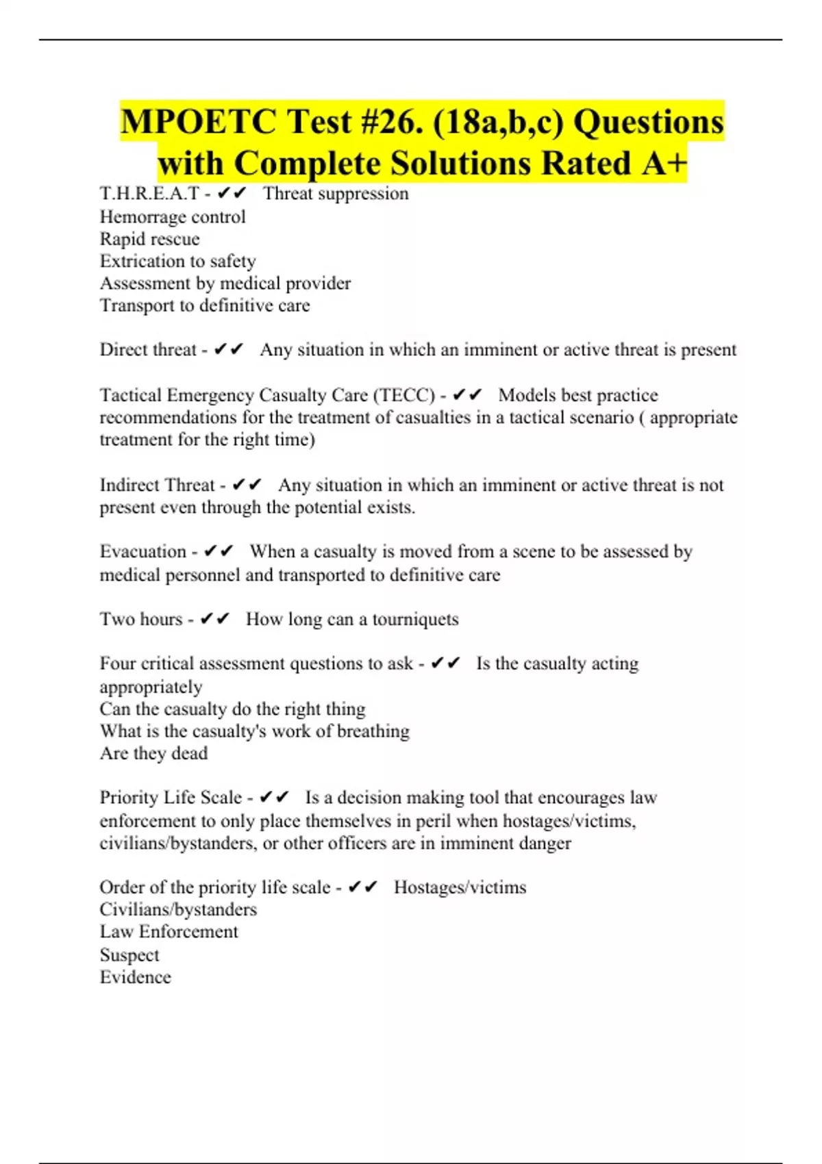 T.H.R.E.A.T - Threat suppression Hemorrage control Rapid rescue Extrication to safety Assessment by medical provider Transport to definitive care Direct threat - Any situation in which an imminent or active threat is present Tactical Emergency Casualty Care (TECC) - Models best practice recommendations for the treatment of casualties in a tactical scenario ( appropriate treatment for the right time) Indirect Threat - Any situation in which an imminent or active threat is not present even through the potential exists. Evacuation - When a casualty is moved from a scene to be assessed by medical personnel and transported to definitive care Two hours - How long can a tourniquets Four critical assessment questions to ask - Is the casualty acting appropriately Can the casualty do the right thing What is the casualty's work of breathing Are they dead Priority Life Scale - Is a decision making tool that encourages law enforcement to only place themselves in peril when hostages/victims, civilians/bystanders, or other officers are in imminent danger Order of the priority life scale - Hostages/victims Civilians/bystanders Law Enforcement Suspect Evidence