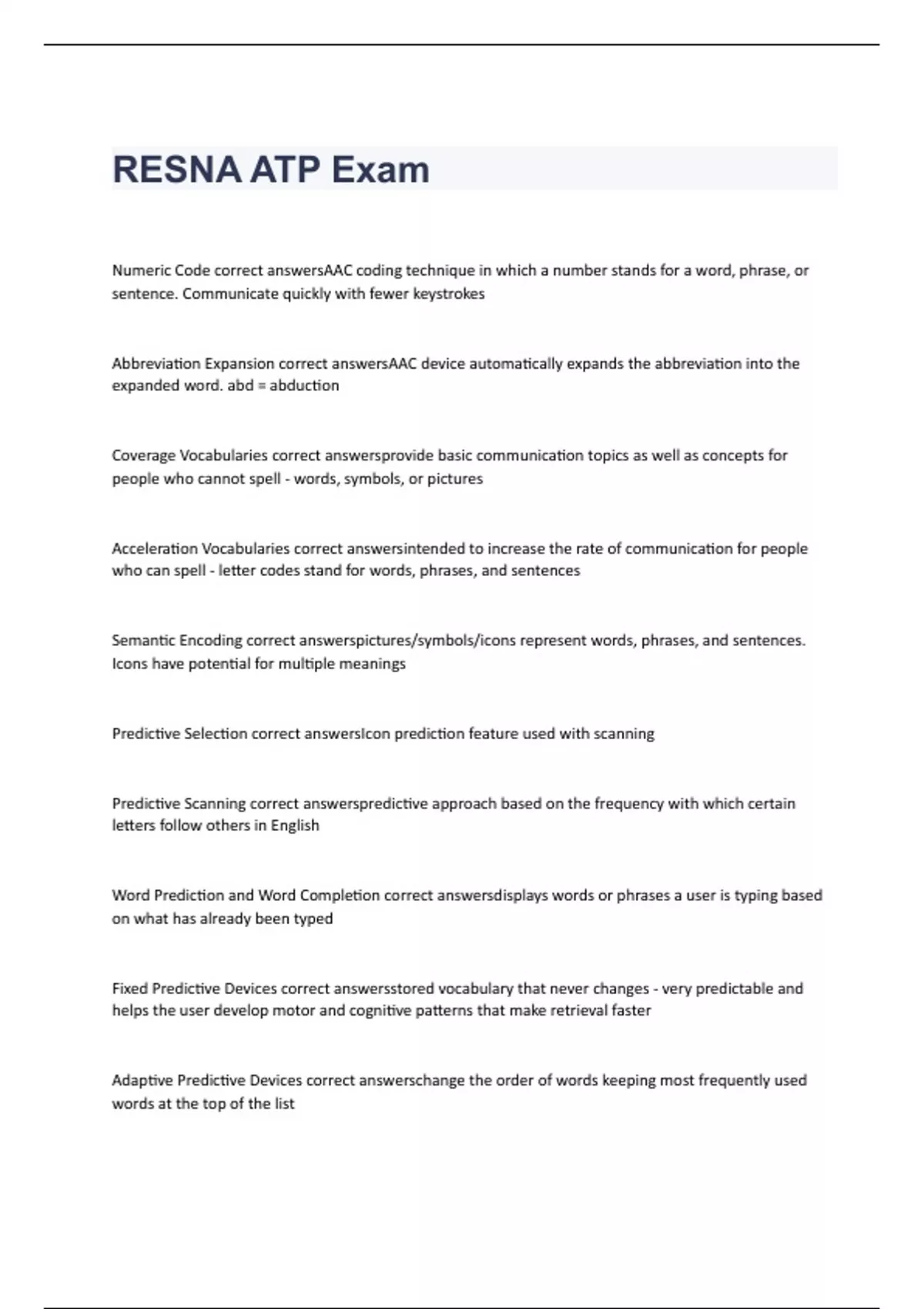 Numeric Code correct answersAAC coding technique in which a number stands for a word, phrase, or sentence. Communicate quickly with fewer keystrokes Abbreviation Expansion correct answersAAC device automatically expands the abbreviation into the expanded word. abd = abduction Coverage Vocabularies correct answersprovide basic communication topics as well as concepts for people who cannot spell - words, symbols, or pictures Acceleration Vocabularies correct answersintended to increase the rate of communication for people who can spell - letter codes stand for words, phrases, and sentences Semantic Encoding correct answerspictures/symbols/icons represent words, phrases, and sentences. Icons have potential for multiple meanings Predictive Selection correct answersIcon prediction feature used with scanning Predictive Scanning correct answerspredictive approach based on the frequency with which certain letters follow others in English Word Prediction and Word Completion correct answersdisplays words or phrases a user is typing based on what has already been typed Fixed Predictive Devices correct answersstored vocabulary that never changes - very predictable and helps the user develop motor and cognitive patterns that make retrieval faster Adaptive Predictive Devices correct answerschange the order of words keeping most frequently used words at the top of the list